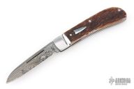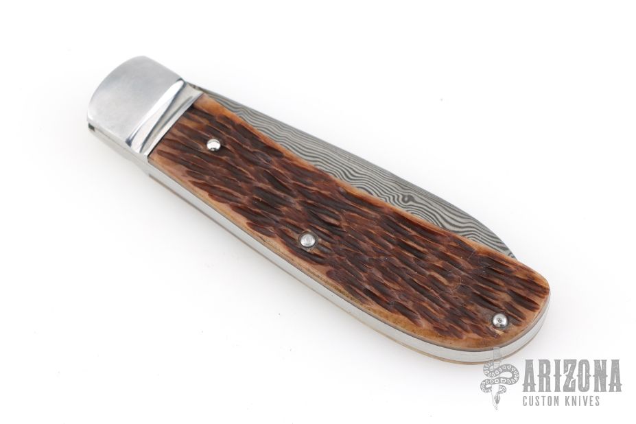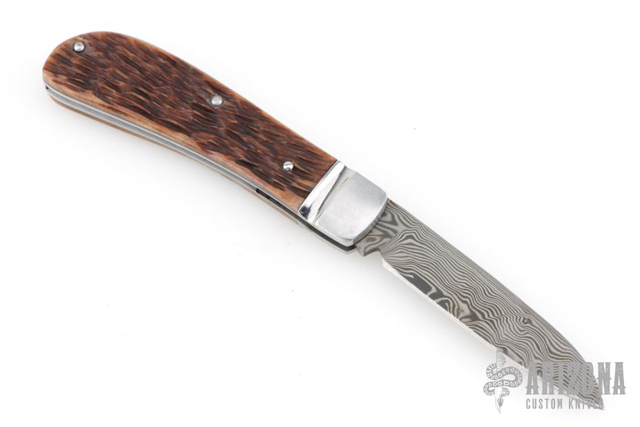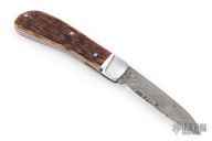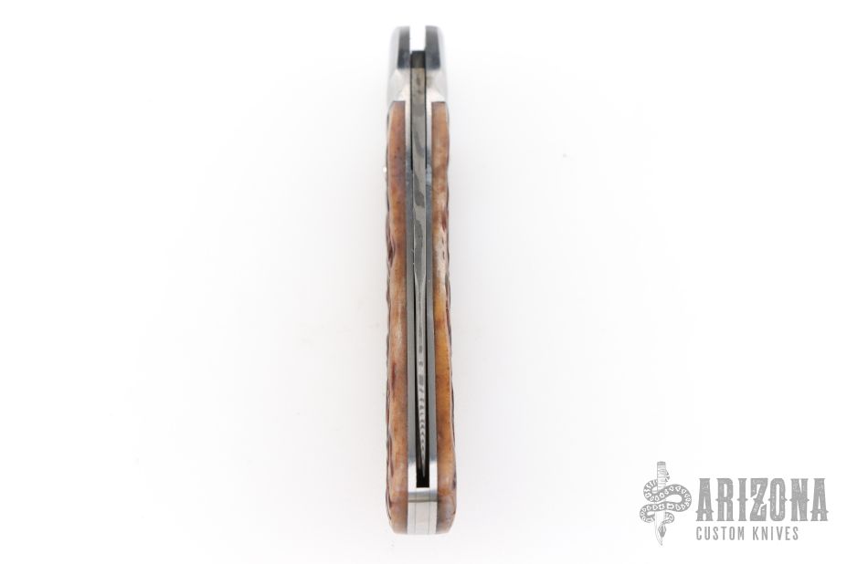 This Mini Zulu Spear by David Taber features a Damasteel blade with a nail nick. The handle has a fluted stainless steel bolsters, Dr. T Jigged bone covers, stainless steel liners, escutcheon and spring. Half stop on blade, flush in all positions. Comes with a leather slip sheath and COA dated November 2025. New from maker.