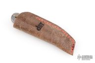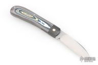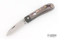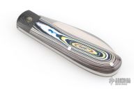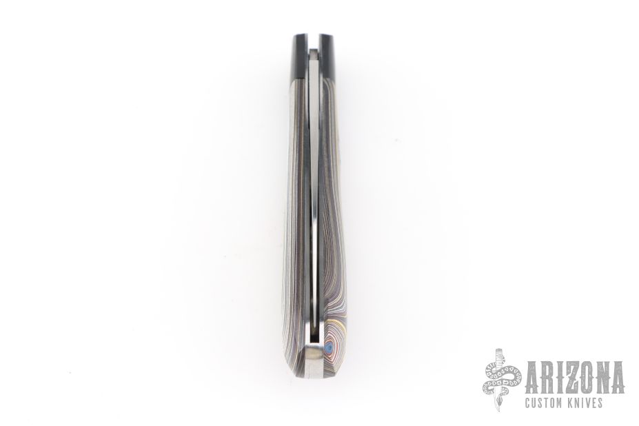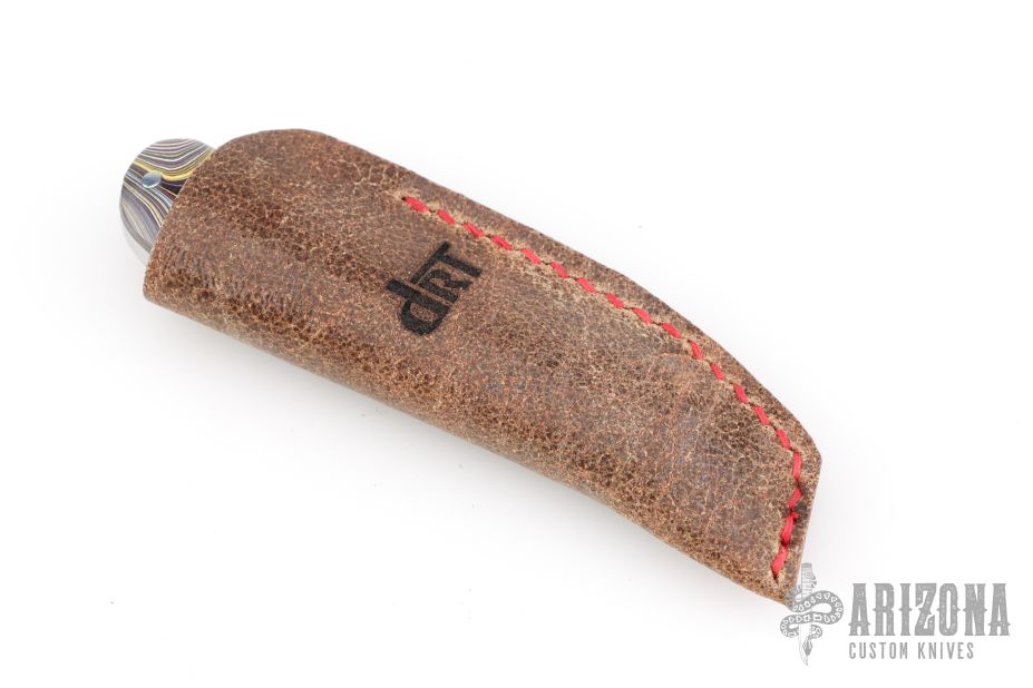 This Zulu Spearpoint from Dr. T. has a hand-rubbed, satin finished blade with nail nick. The handle has carbon fiber bolsters, Corvette Fordite covers, stainless steel escutcheon, liners and spring. Spring is flush in the closed, half stop, and opened position. Blade is centered when closed. Comes with a leather slip sheath and COA dated December 2025. New from maker.