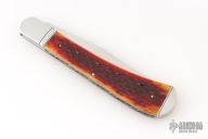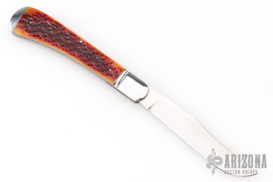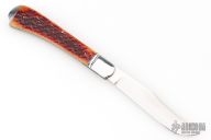 This slipjoint by Couch Knives features a hand rub satin finished blade with nail nick. The handle has threaded and fluted stainless steel bolsters with integral fileworked liners, red jigged bone covers with a stainless steel escutcheon, fileworked stainless steel spring. Has half-stop, flush in all positions. Comes with a zippered case. Excellent condition.