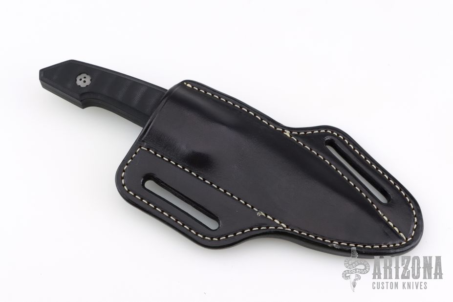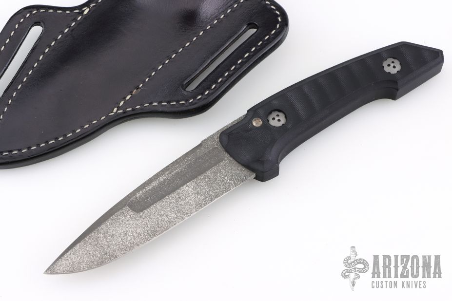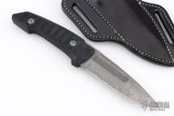 This Ottoman Fixed Blade by Allen Elishewitz features a Black Snow finished blade with milled fullers, textured spine, .154" blade stock and 1.148" blade depth, mortise tang construction. The handle has a two-piece black G-10 grip with decorative pins in the spine of the handle. Comes with a welted replacement black leather sheath made by Outrider Leather (the original sheaths had issues and didn't have a welt). Comes with COA. Excellent condition.