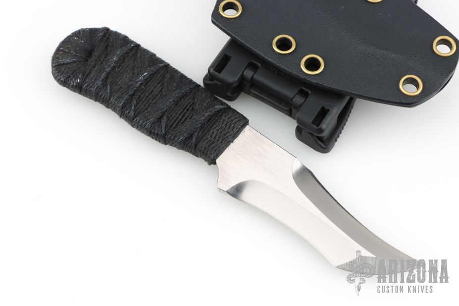 This Custom Tanto Pikal by Bantang Knives features a satin finished chisel ground blade with sharpened top edge, .126" blade stock and 1.065" blade depth, hidden tang construction. The handle has black cord wrap over black cord. Comes with a kydex sheath. Has a couple light scratches, otherwise excellent condition.