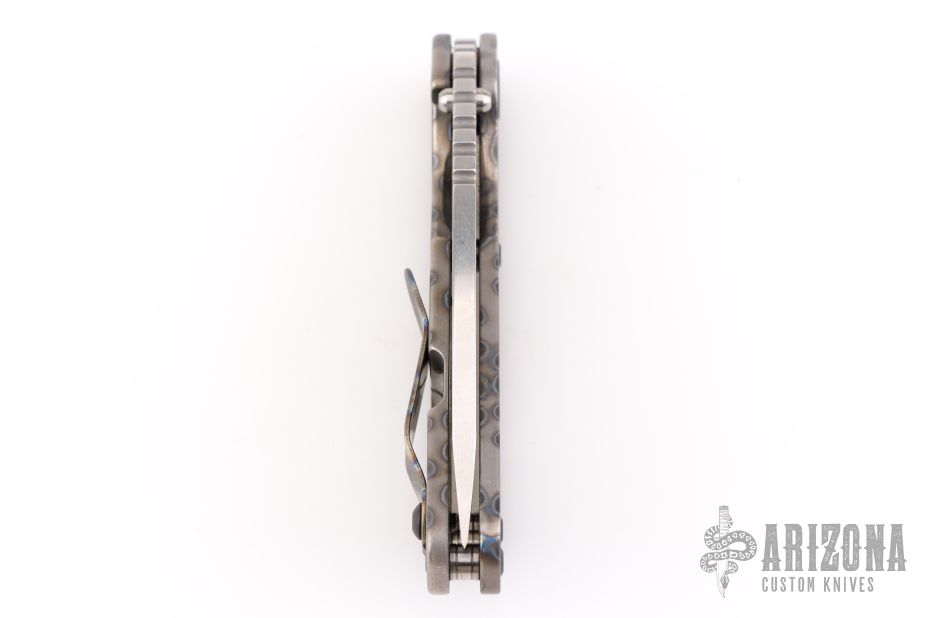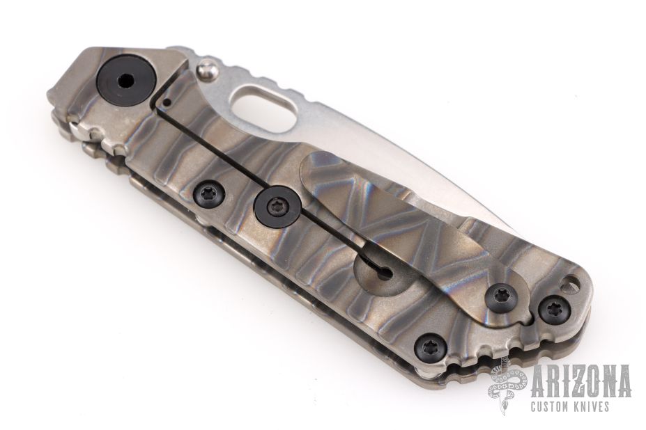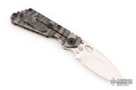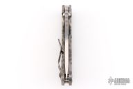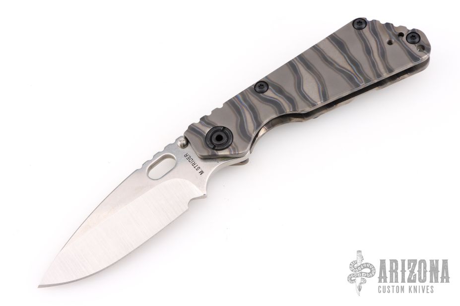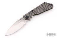 This SNG by Mick Strider features a ghost striped blade with notched thumbrest and thumbhole. The handle has a Disruptive Strider Striped (DSS) finished titanium frame with matching tip up clip. Excellent Condition.