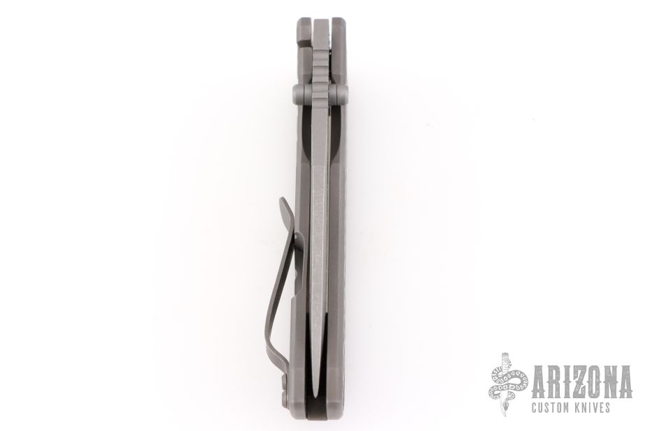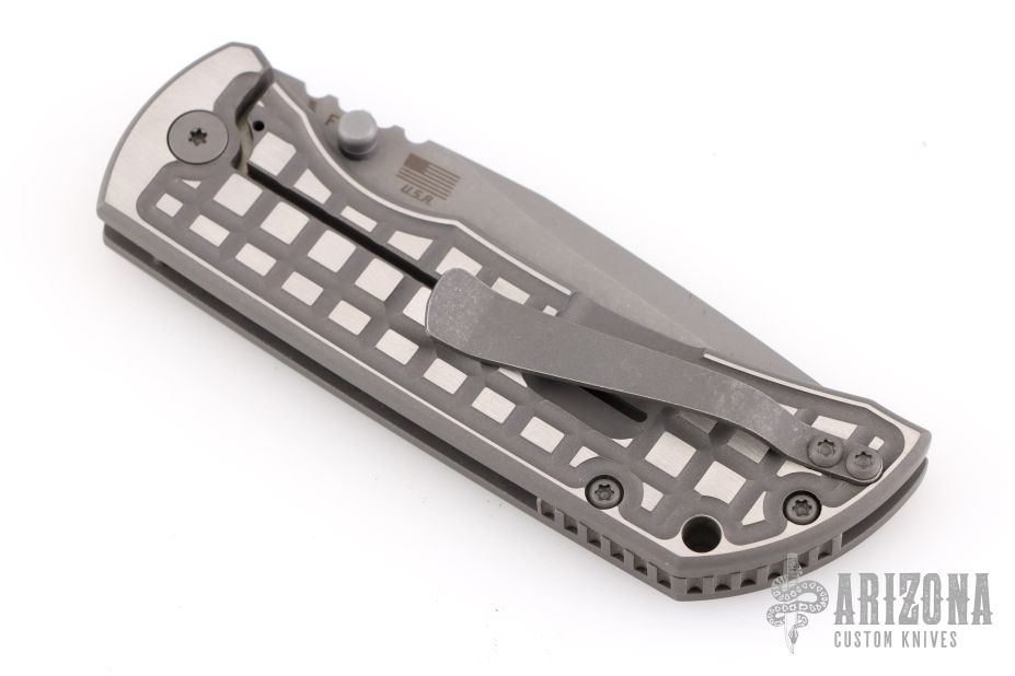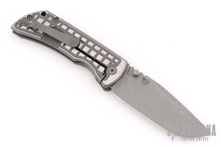This MAC2 features a stonewashed clip point Magnacut blade with dual thumbstuds and a notched thumbrest.  The handle features a stonewashed two-tone anodized atomic titanium frame with anodized hardware, and a matching tip up pocket clip. Includes the original box and COA. Excellent Condition.