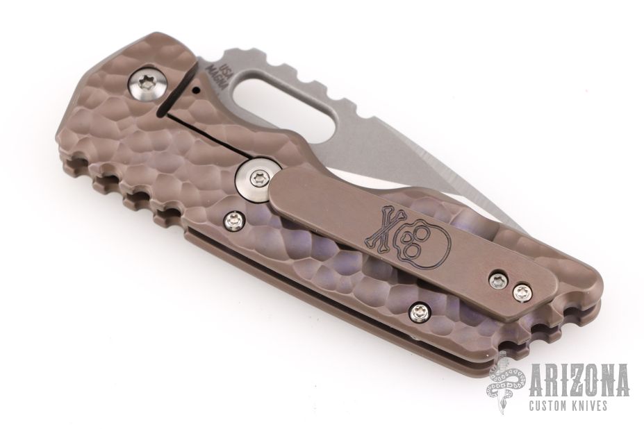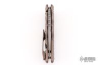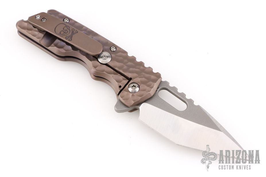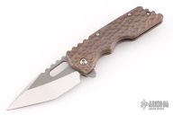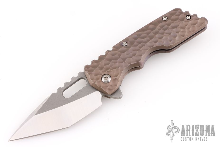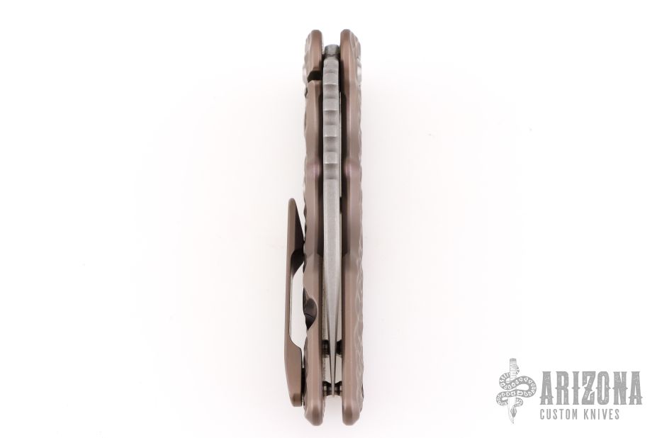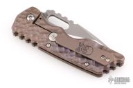 This Mark 2 Framelock by A2D Mercantile features a satin finished Hissatsu Rising Grind blade with notched thumb rest, and thumb hole. The handle has a Hammered Bronze Electro Anodized titanium frame, titanium tip up clip. Nice detent, lockup and blade seating. Comes with maker's zipper case and dog tag COA. Excellent condition.