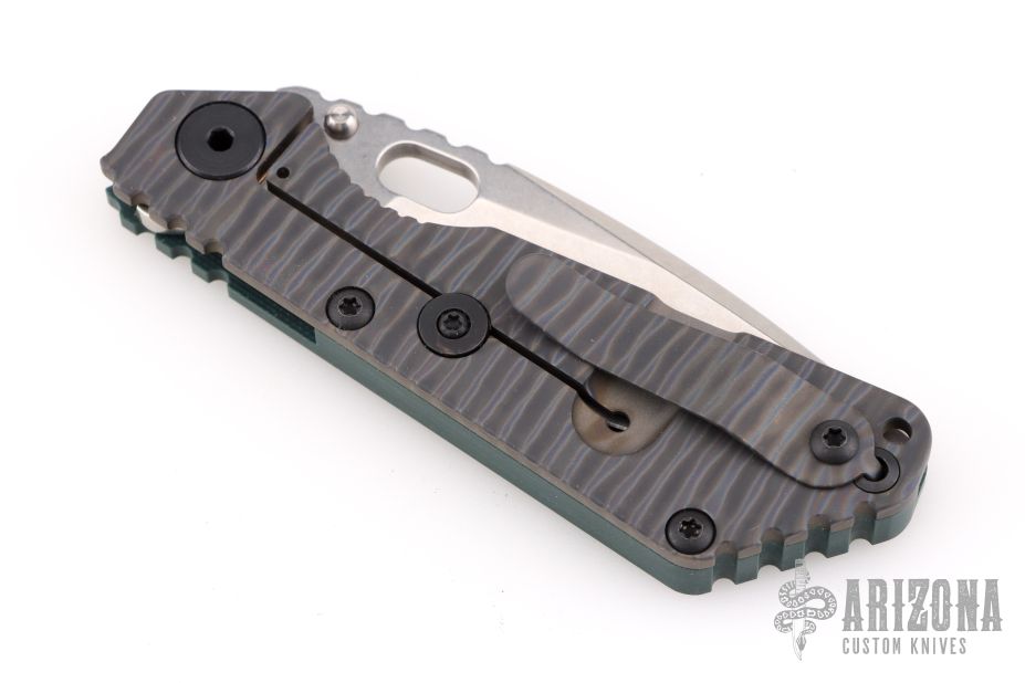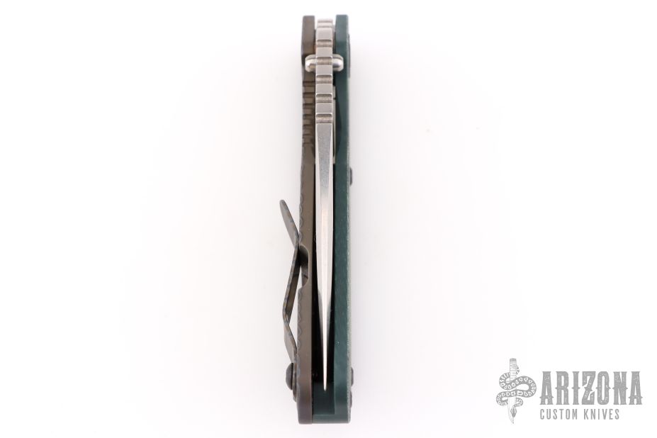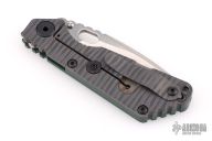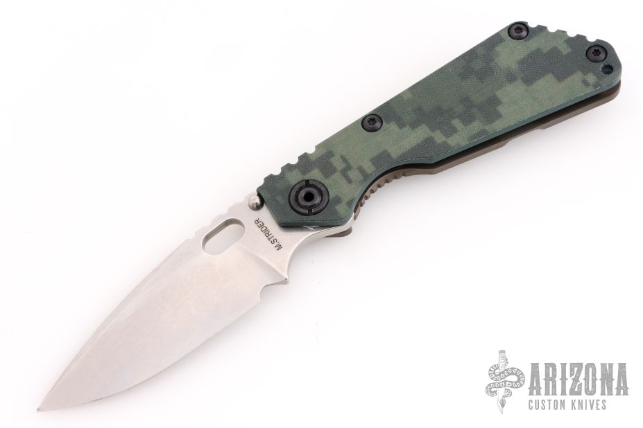 This Mick Strider SNG framelock folder features a stonewash blade with thumbhole and notched thumbrest. The handle has an ACS Camo G-10 and flamed titanium frame with titanium clip, tip up carry. Jimping on blade spine. Nice lockup, and blade seating. Excellent condition.