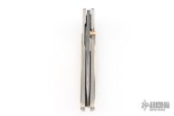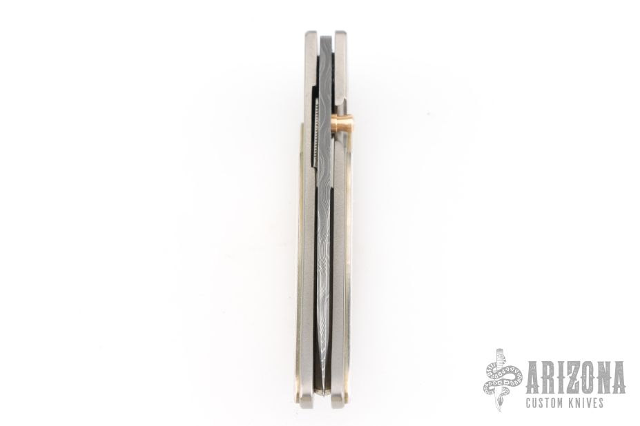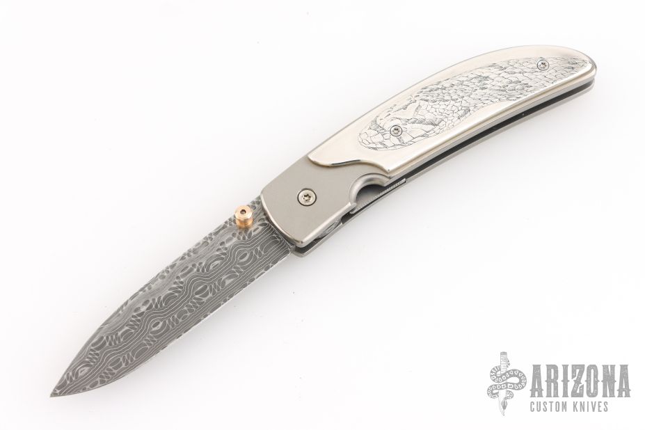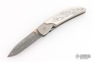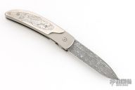 This knife by Bob Terzuola features a Stainless Damascus blade with single gold thumbstud. The handle has engraved sterling silver scales with engraving of a snake, bead blasted titanium frame, inlaid titanium liner, two-tone sterling silver backspacer. Nice detent, lockup and blade seating. Comes with a zippered case. Has a couple very light scratches, otherwise excellent condition.