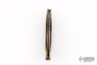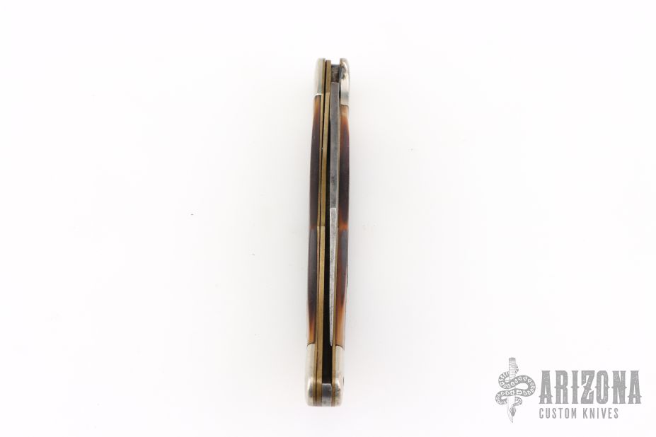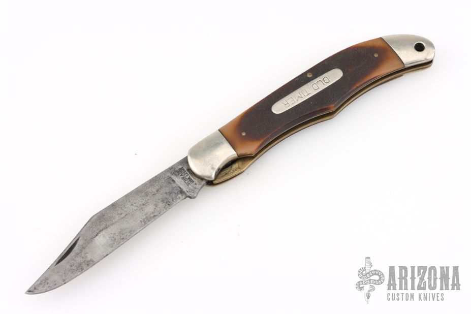 This Old Timer liner lock from Schrade Cutlery features a satin finish clip point blade with nail nick. The handle is comprised nickel silver double bolsters/escutcheon, with sawcut Delrin covers over brass liners and stainless steel back spring. Lanyard hole in pommel. Has some scratches, and patina. Fair condition.