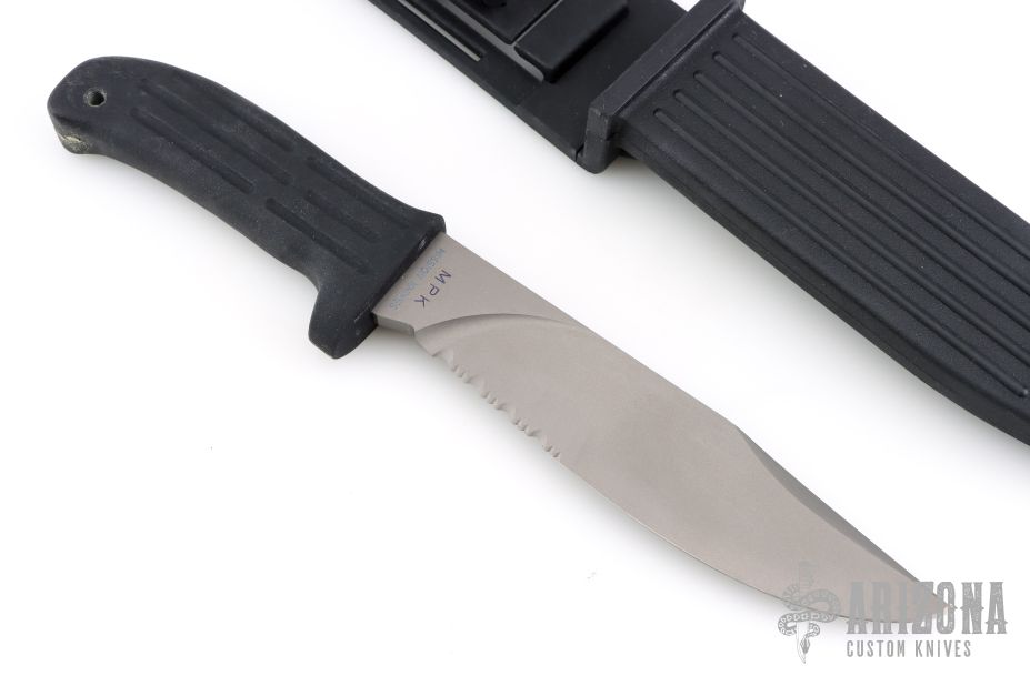 This MPK from Mission Knives features a clip point titanium partially serrated bead blasted titanium blade, .252" blade stock and 1.543" blade depth, hidden tang construction. The handle is comprised of an black Kevlar strengthened kytrel. Lanyard hole on the pommel. Includes original box and sheath with leg strap. Excellent condition.