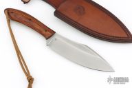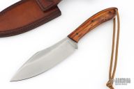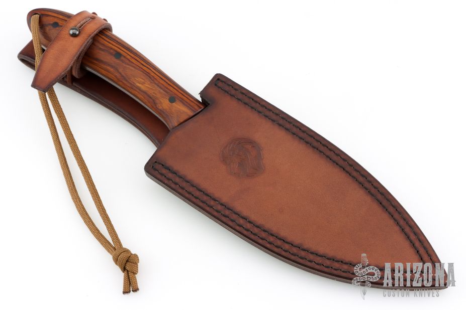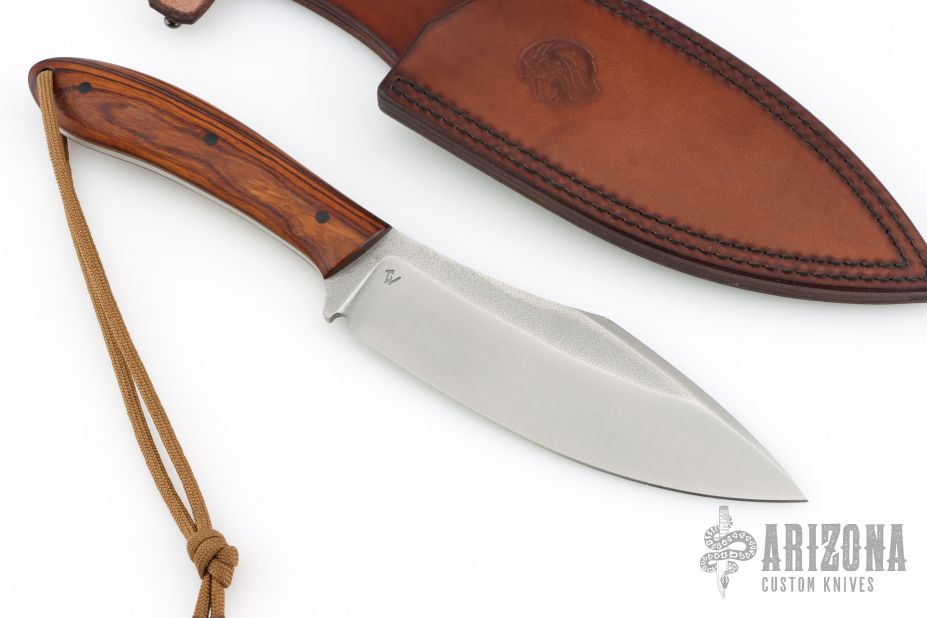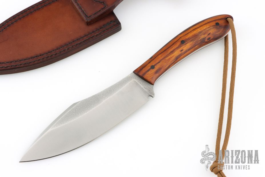 This Gross Mann (meaning "Large Man") by Petr Weingartner features a Scotchbrite finished blade with false top edge and notched thumbrest, .154" blade stock and 1.738" blade depth, full tang construction. The handle has desert ironwood scales with black carbon fiber pins and a lanyard hole.  Includes a brown leather sheath and COA dated 1/30/2026. New from maker.