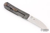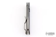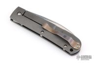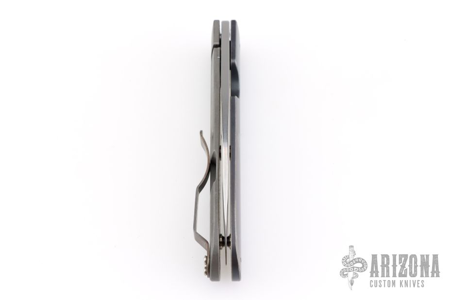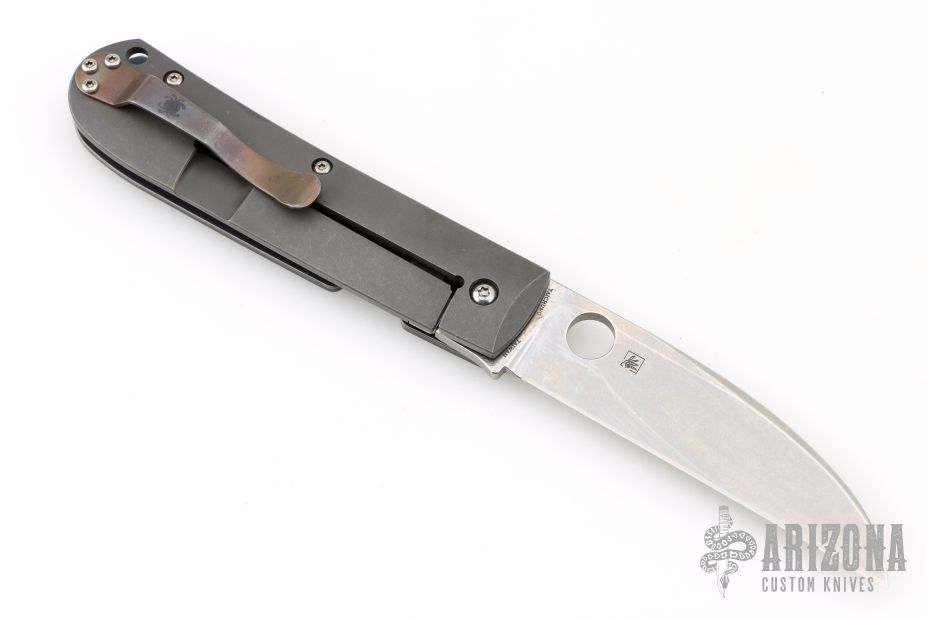 This knife features stonewashed wharnecliff blade with a thumbwhole.  The handle has anodized titanium frame with a matching tip-down pocket clip.  The anodization is fading.  Includes a padded zippered case.  Has scuffs/scratches otherwise excellent condition.