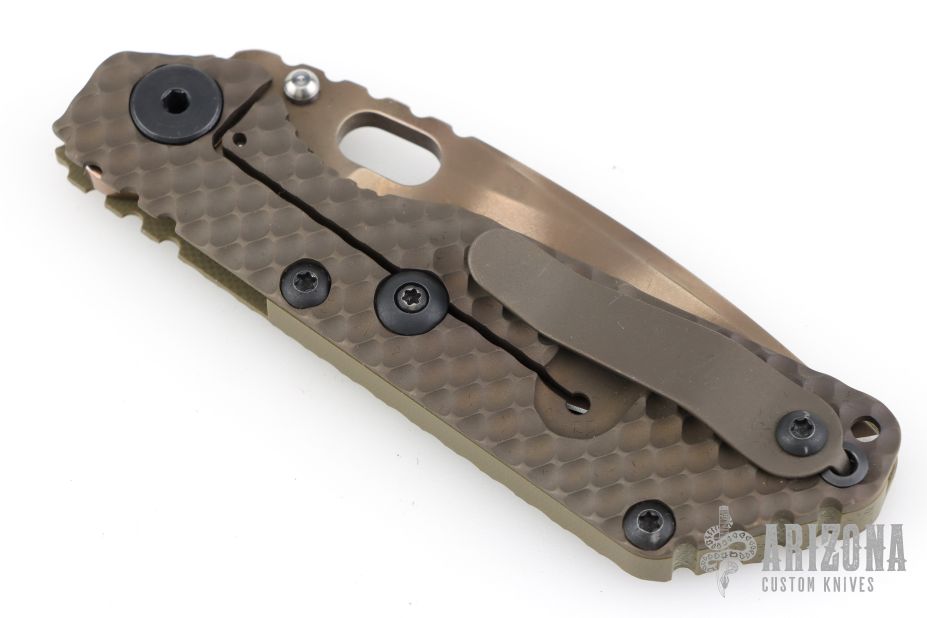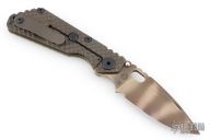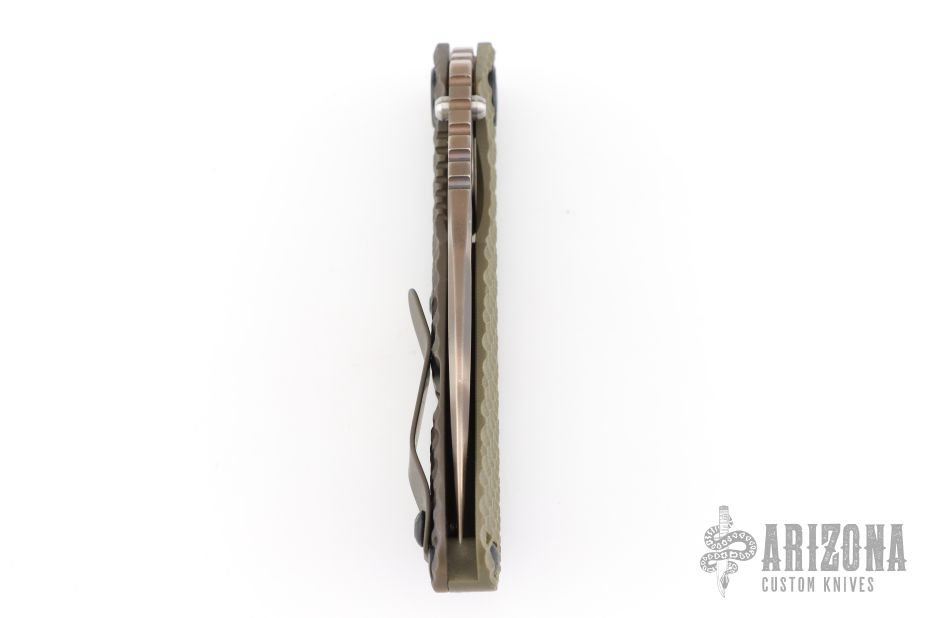 This SNG DGG by M Strider has a stonewashed and ghost striped blade with bronzed finish, dual thumb studs, thumbhole, and notched thumbrest. Handle is green G-10 and an antique bronze titanium "Gunner Grip", lockbar stabilizer, and titanium tip up clip. Nice detent, lockup and blade seating. Has a couple light scuffs on the clip, otherwise excellent condition. Comes with a zippered case.