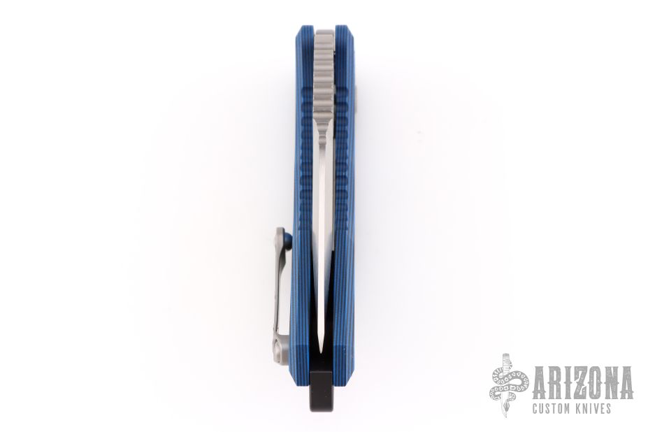 This Medusa by Heretic Knives features a stonewashed tanto blade with false top edge, notched thumbrest. The handle has a black/blue G-10 frame with checkered push button, black backspacer and a blasted tip up stainless steel clip with ceramic ball. Comes with original box and papers. #00282. New condition.