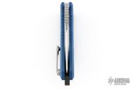 This Medusa by Heretic Knives features a stonewashed tanto blade with false top edge, notched thumbrest. The handle has a black/blue G-10 frame with checkered push button, black backspacer and a blasted tip up stainless steel clip with ceramic ball. Comes with original box and papers. #00354. New condition.