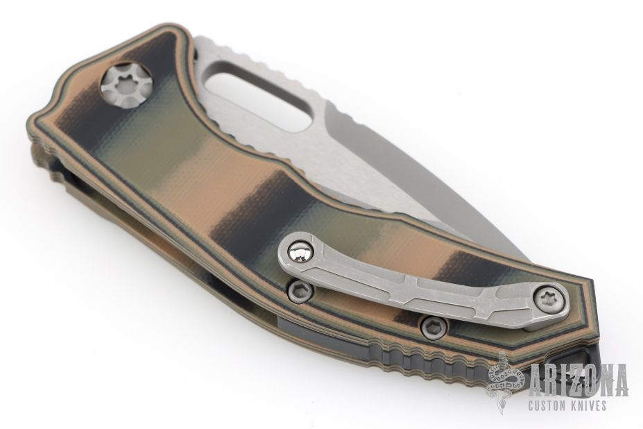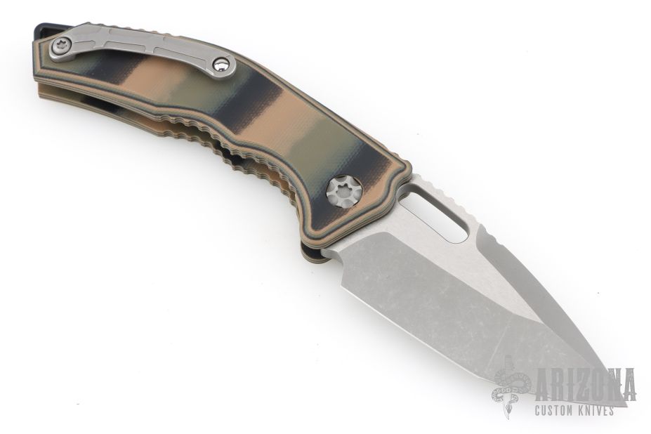 This Medusa by Heretic Knives features a battleworn tanto blade with false top edge, notched thumbrest. The handle has a Tri-Camo G-10 frame with checkered push button, black backspacer and a battleworn tip up stainless steel clip with ceramic ball. Comes with original box and papers. #00414 and dated 02/2025. New condition.