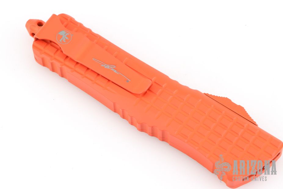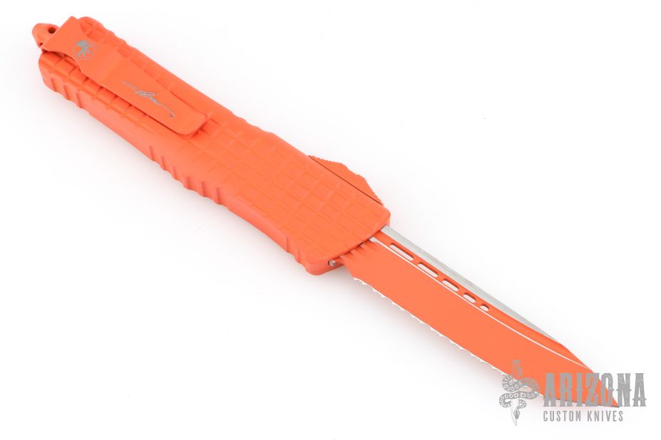 This Combat Troodon by Microtech features an orange cerakote fully serrated tanto blade with fullers. The handle has an orange cerakote frag pattern aluminum frame with orange cerakote hardware and tip down clip. Comes with original box and papers. New condition.
