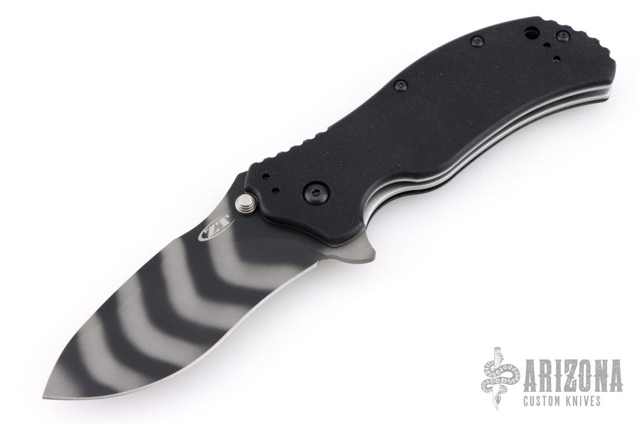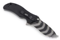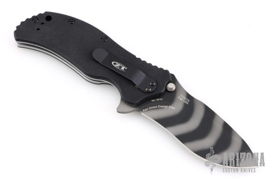 This 0350TS liner lock flipper is a Ken Onion design executed by Zero Tolerance and features a recurved spear-point blade with a tiger stripe finish, stainless steel liners and black G10 scales. It also features the Speed-safe assisted opening system. The black coated steel clip is 4 way adjustable. Perfect function. Includes original box and papers. Excellent Condition.  #56143.