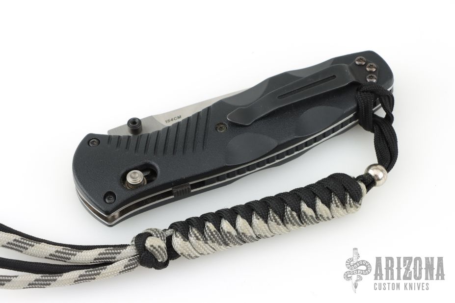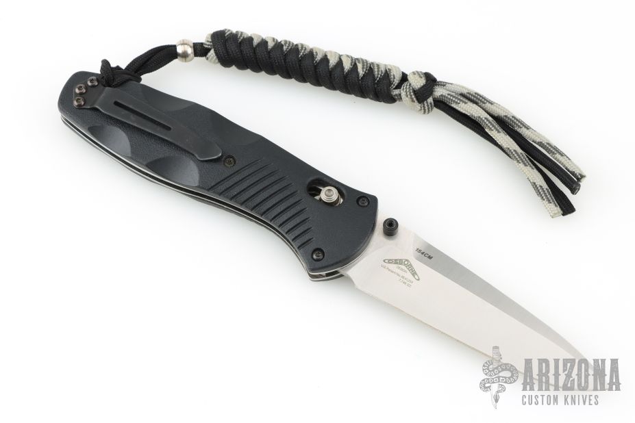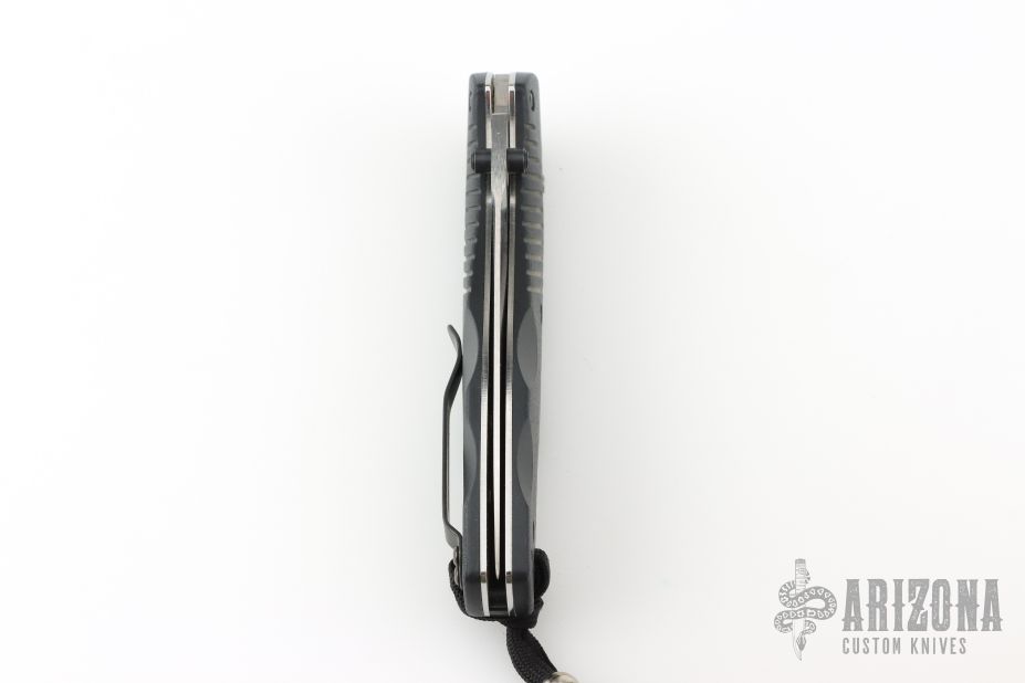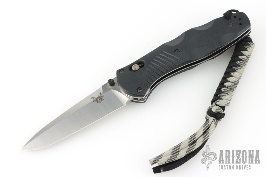 This 580 Barrage from Benchmade features a stonewash finished drop point blade with swedge and dual thumbstuds. The handle is comprised black FRN scales over stainless steel liners and FRN backspacer. This knife also features the AXIS lock mechanism and sliding safety on spine. Has an attached lanyard. Comes with original box and drawstring pouch. Excellent condition.