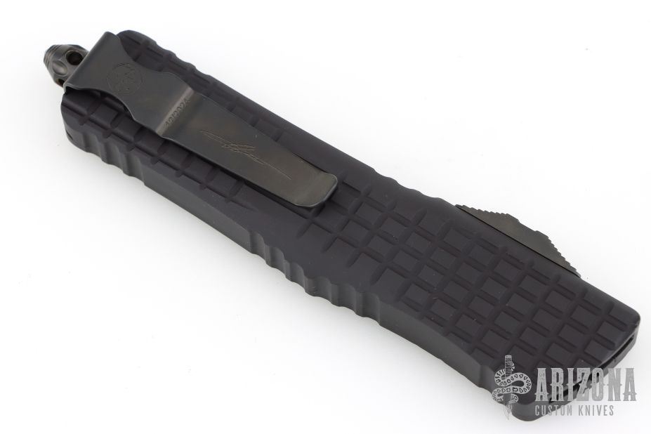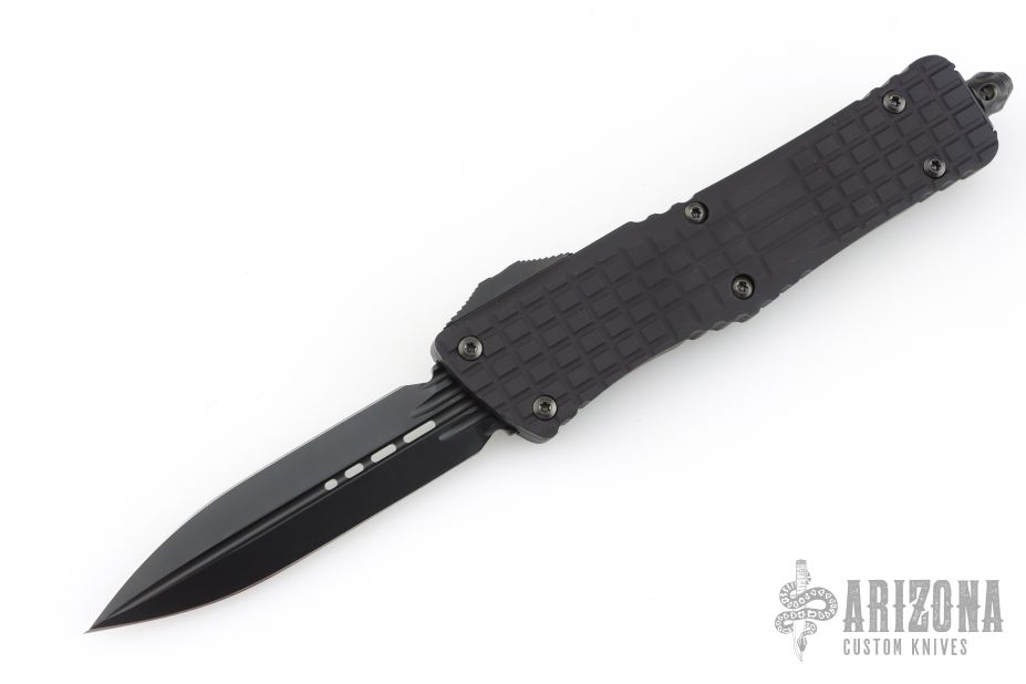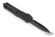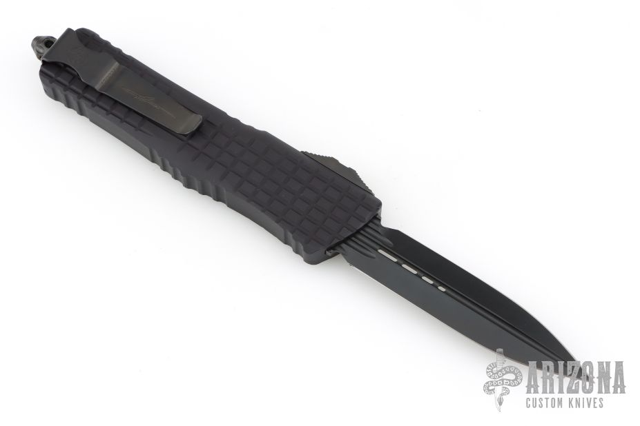 This Combat Troodon OTF automatic by Microtech knives features a double edged, DLC finished blade. The handle has a DLC frag pattern aluminum handle with black hardware, tip down carry. Glass breaker. Comes with original box and papers. New condition. Dated 12/2024.