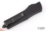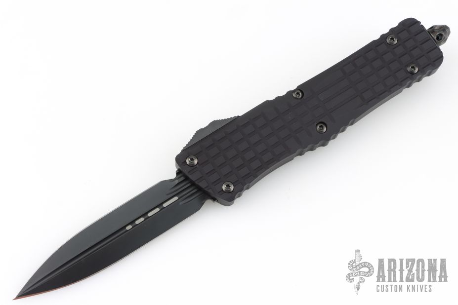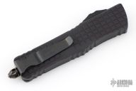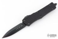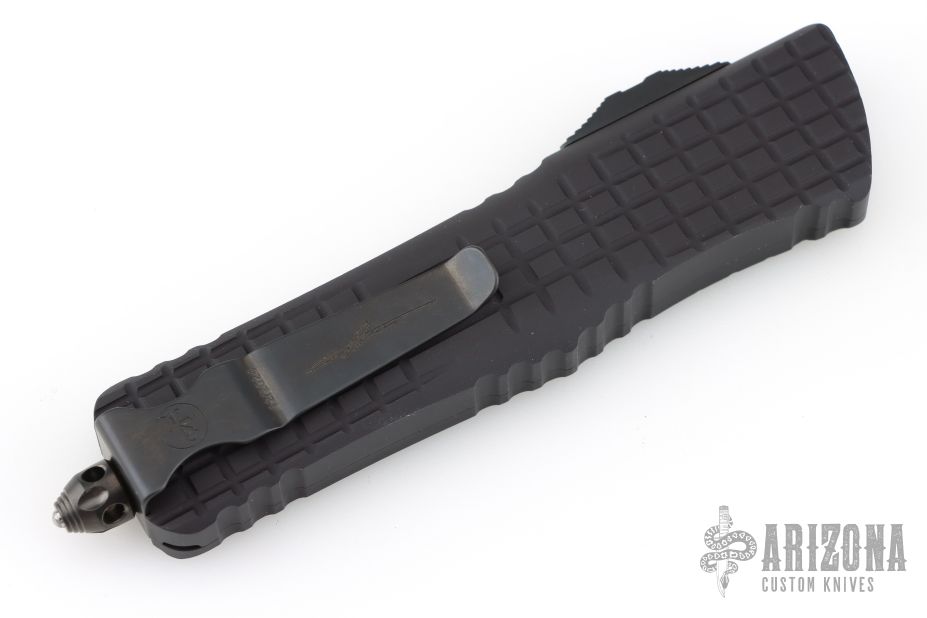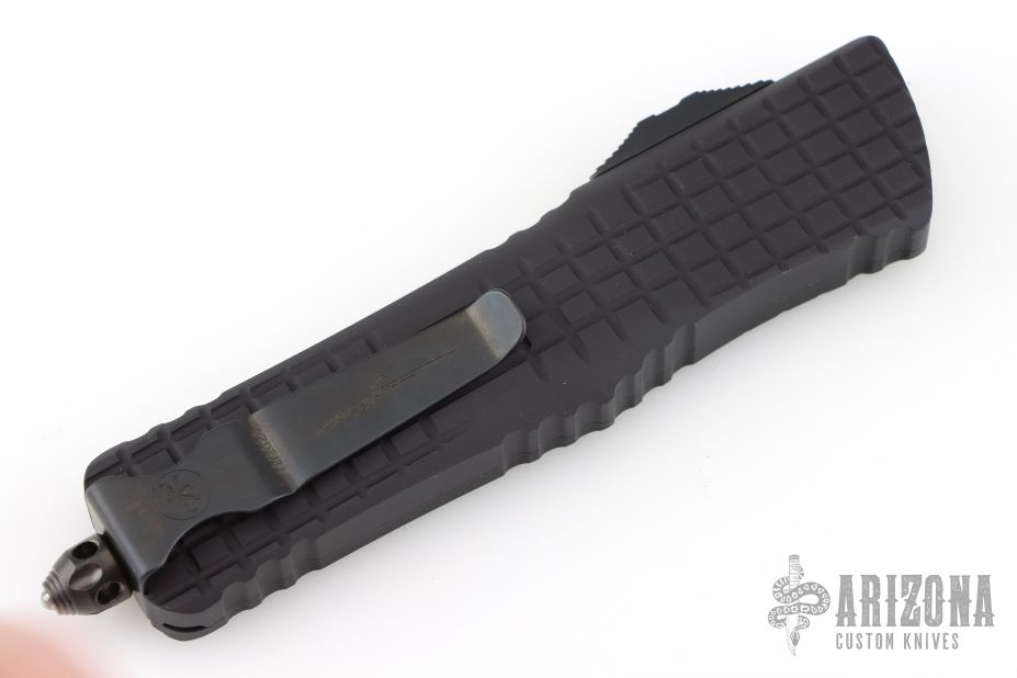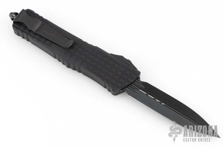 This Combat Troodon OTF automatic by Microtech knives features a double edged, DLC finished blade. The handle has a DLC frag pattern aluminum handle with black hardware, tip down carry. Glass breaker. Comes with original box and papers. New condition. Dated 12/2024.