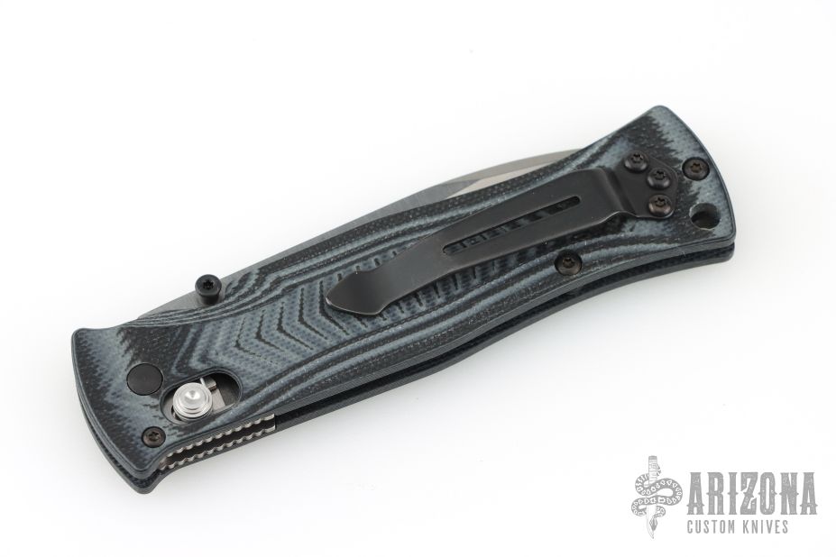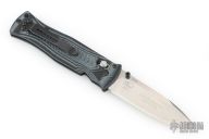 This Model 531 from Benchmade features a stonewashed spear point blade with swedge and dual thumb studs. The handle is comprised of black and gray G10 and stainless steel liners. Stainless steel reversible tip up clip. Lanyard hole in pommel. Comes with original box, pouch, and papers. Excellent condition.