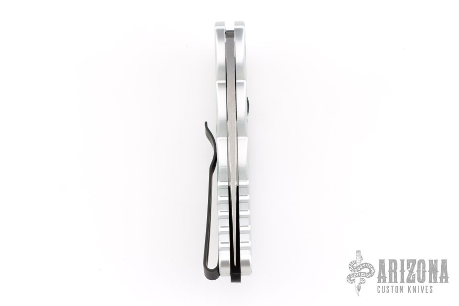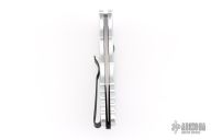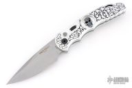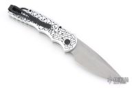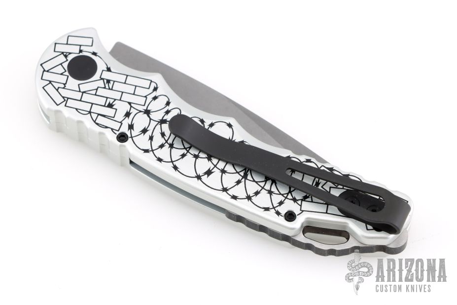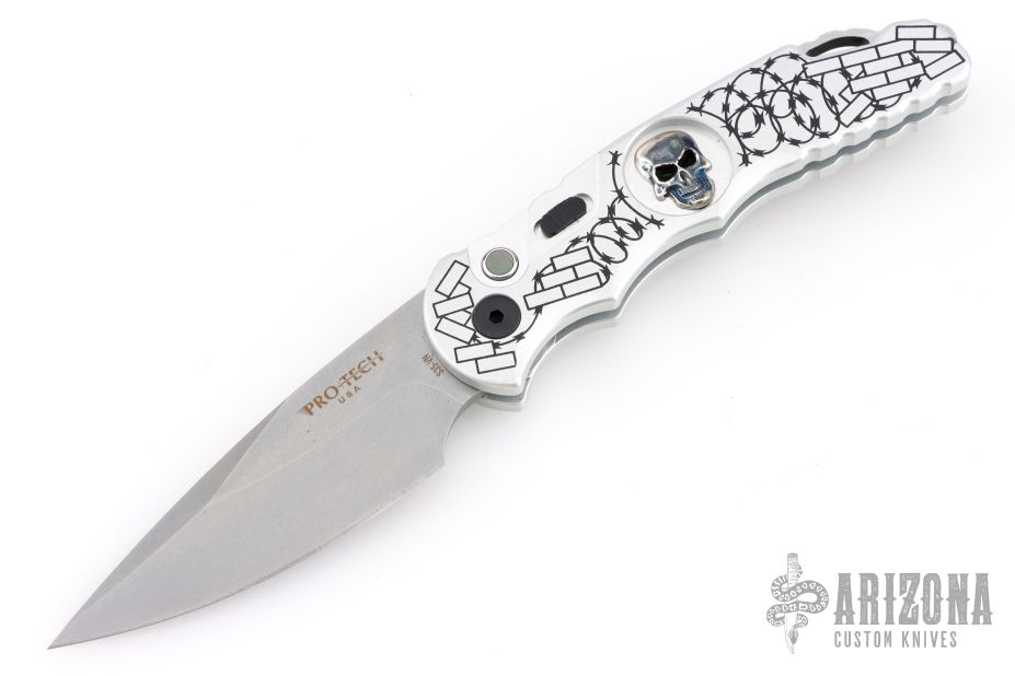 This TR-5.62 by Pro-Tech Knives features a stonewashed spear point blade. The handle has a silver aluminum handle with Shaw skull inlay, barbwire graphic, stainless steel backspacer with lanyard hole, tip up blade stainless steel clip.  Comes with original box and papers.  Excellent condition.