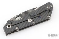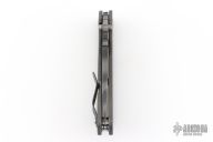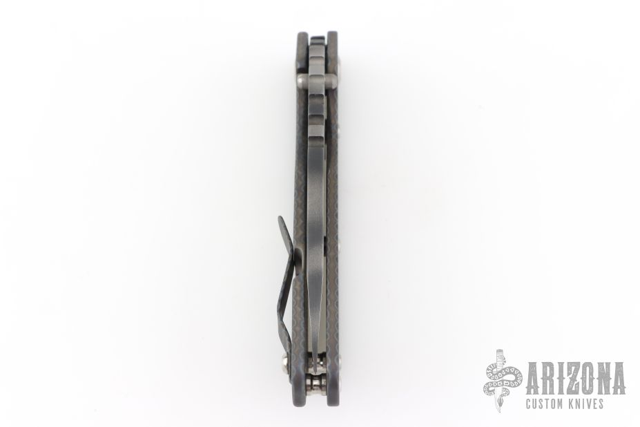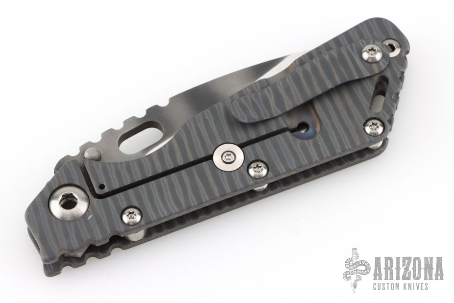 This Mick Strider Performance Series SMF framelock folder features a tiger strip finished spear point blade with thumbhole and notched thumbrest, the blade has been reground and satin finished bevels. The handle has a flamed titanium frame with titanium clip, tip up carry. Jimping on blade spine. Includes Hinderer "Lock Bar Stabilizer" for maximum reverse lock retention. Nice detent, lockup and blade seating. Has a couple light scuffs, otherwise excellent condition.