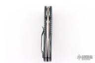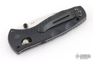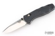 This Mini Barrage by Benchmade Knives features a drop point tumble finished blade with dual thumbstuds. Assisted opening. The handle has black FRN scales with stainless steel liners, and a fileworked aluminum backspacer. Black tip up stainless steel clip. Comes with original box and pouch. Has a couple light marks, otherwise Excellent condition.