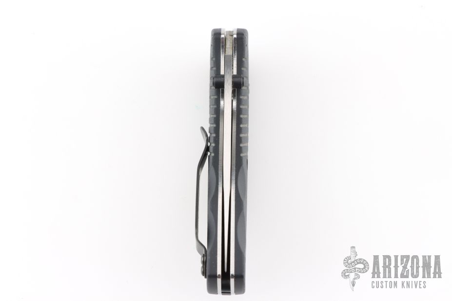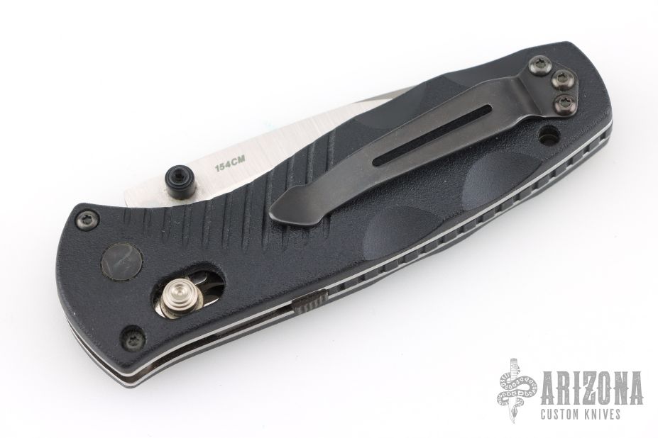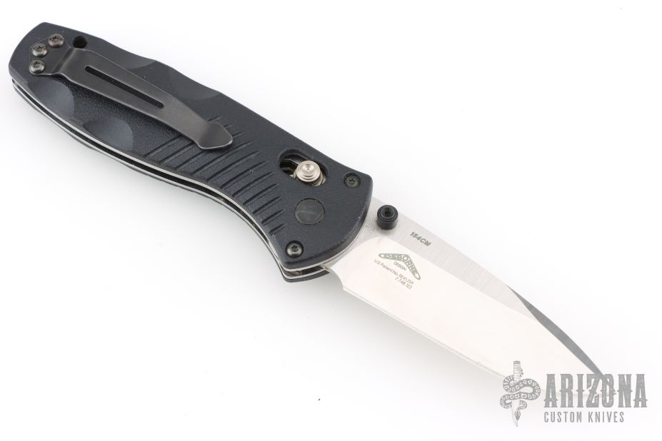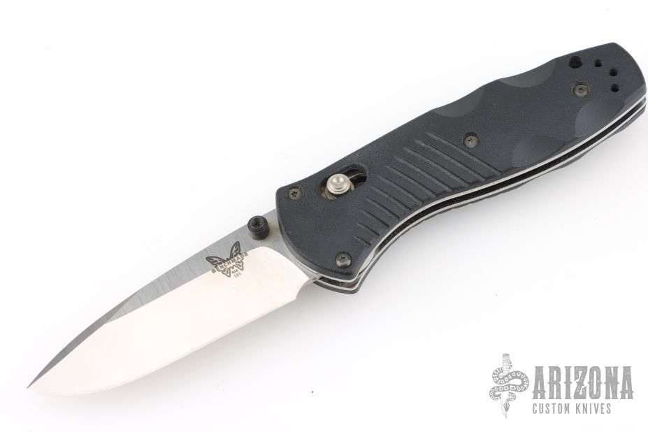 This Mini Barrage by Benchmade Knives features a drop point tumble finished blade with dual thumbstuds. Assisted opening. The handle has black FRN scales with stainless steel liners, and a fileworked aluminum backspacer. Black tip up stainless steel clip. Comes with original box and pouch. Has a couple light marks, otherwise Excellent condition.