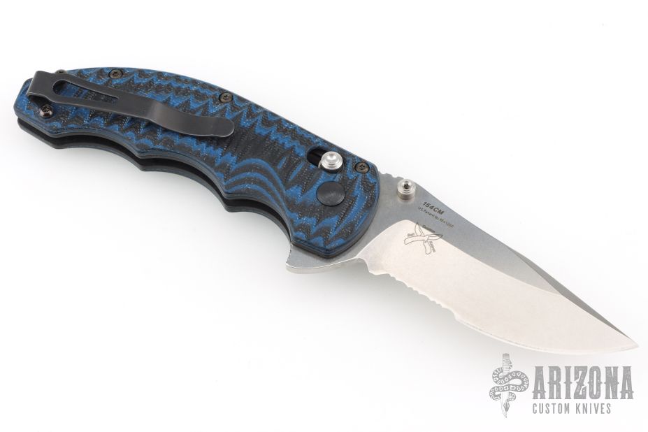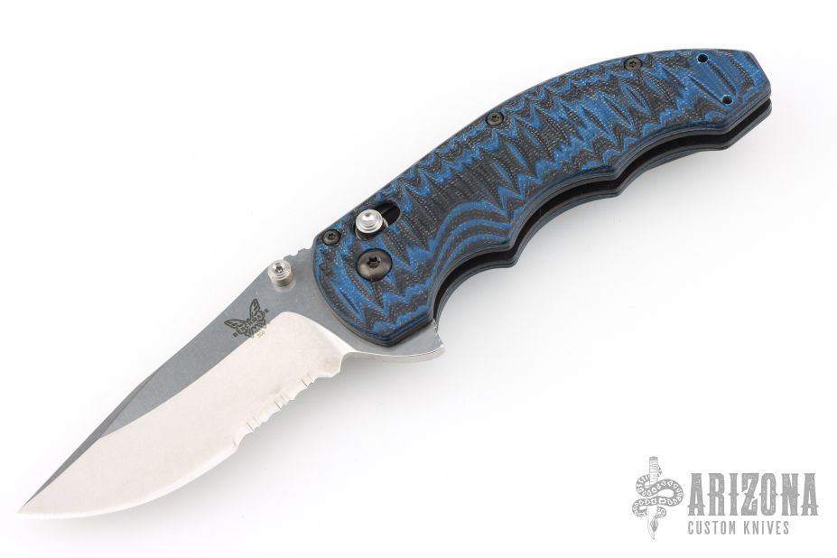 This Ball Axis lock flipper by Benchmade Knives features a stonewashed clip point blade with notched thumbrest, part serrations, flipper and dual thumbstuds. The handle has black/blue G-10 scales with black stainless steel liners and tip up reversible clip. Comes with original box, pouch, and papers. Excellent Condition.