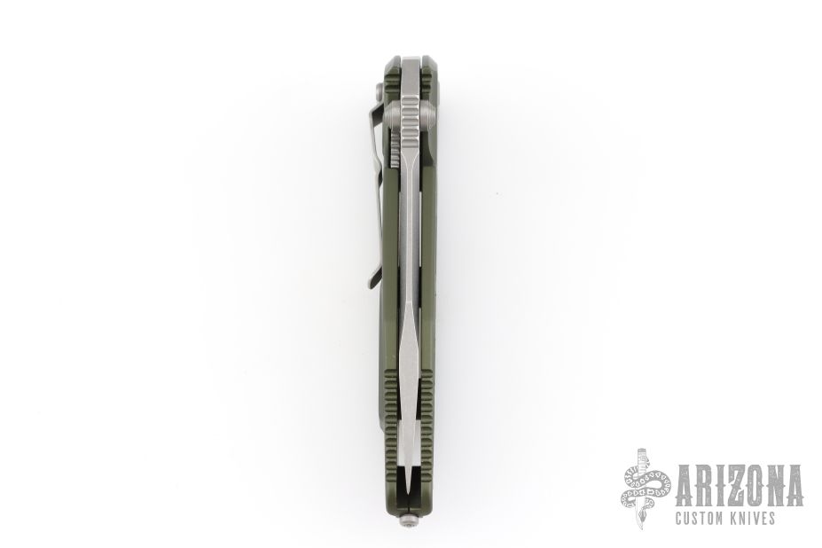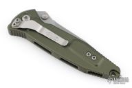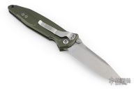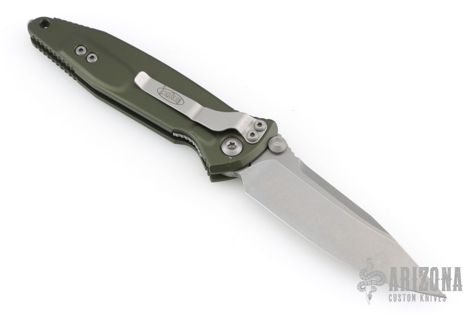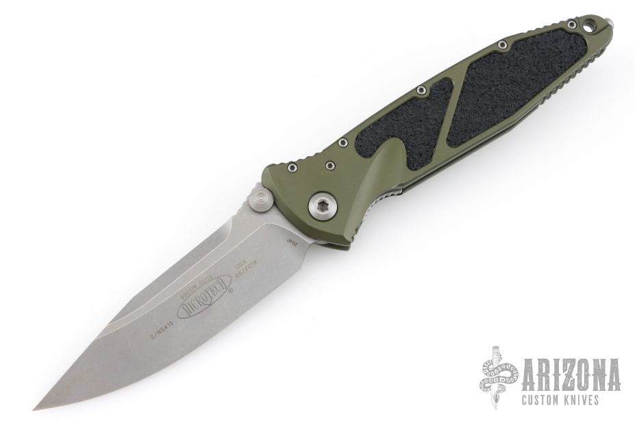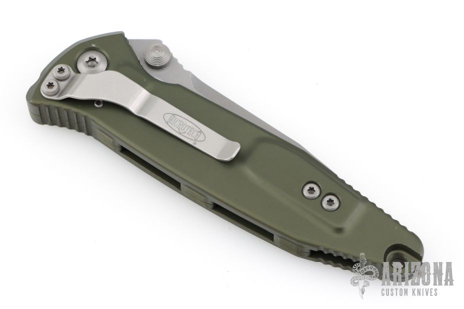 This Socom Elite manual linerlock folder by Microtech Knives has a stonewashed blade with notched thumbrest and dual thumbstuds. Has an OD Green aluminum handle with non-slip inlays, tip down blasted stainless steel clip. Serial number 5415 and dated 06/2019. Comes with original box and papers. Has a few light scuffs, otherwise excellent condition.