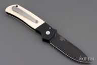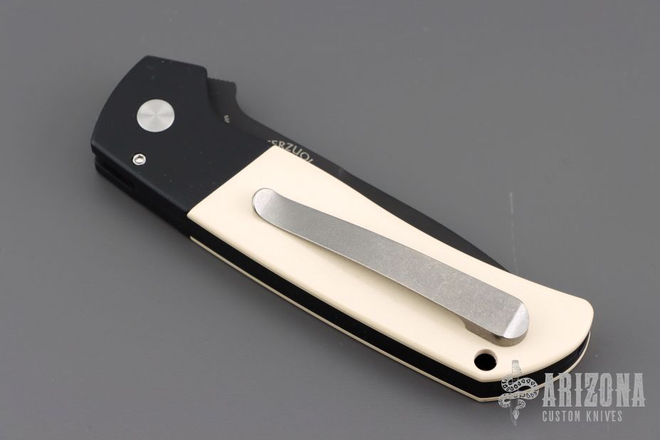 This ATCF Auto by Pro-Tech features a DLC Magnacut blade with notched thumbrest. The handle has a black aluminum frame with ivory paper micarta scales, tip up milled titanium clip with hidden screws. Comes with original box and papers. Excellent condition.