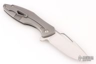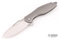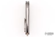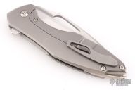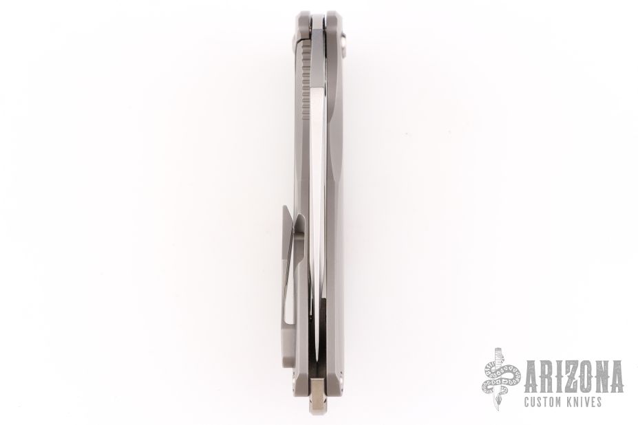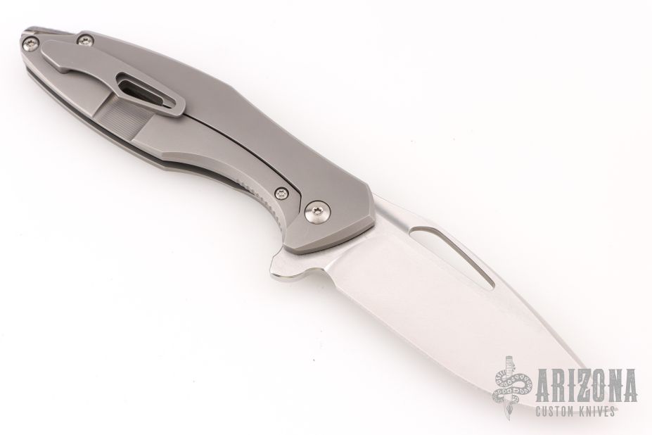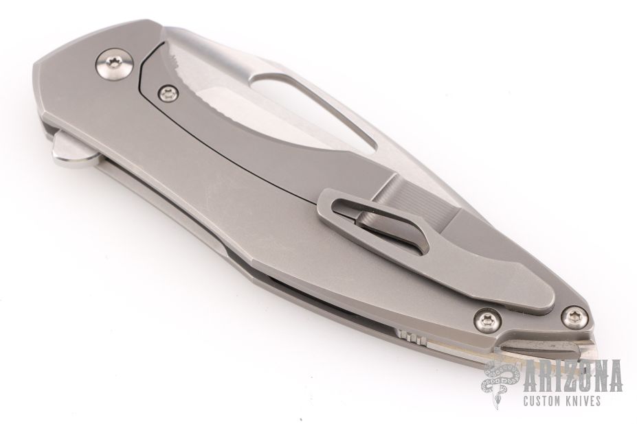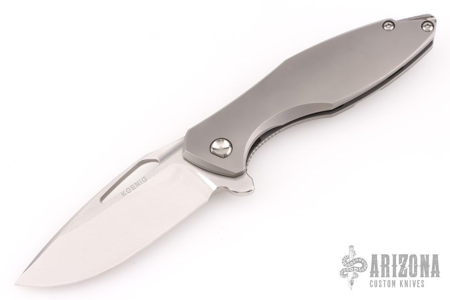 This Arius by Koenig knives features a Burnished finished blade with polished flats thumbhole and flipper. The handle has a bead blasted titanium frame with a titanium tip up clip, titanium backspacer. Has ceramic bearings and a ceramic detent ball. Nice detent, lockup and blade seating. Comes with original box and COA February 25, 2022, Gen4B9. Has some light scuffs, otherwise excellent condition.