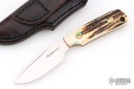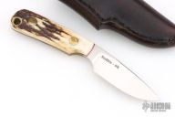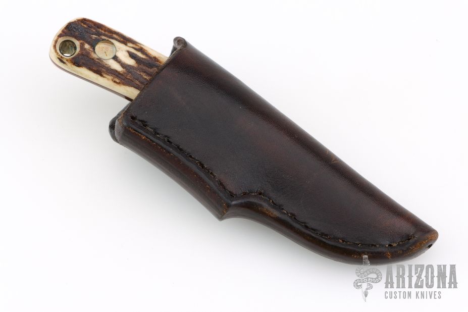 This knife by AG Russell Shopmade features a satin finished blade with .121" blade stock and .854" blade depth, hidden/frame tang construction. The handle has stag scales with red liners, brass frame. Comes with a brown leather sheath. Excellent condition.