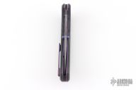 This Reaper folder from Eric Kramer features an acid tumble finished blade with swedge and dual thumbstuds. The handle is made of carbon fiber dovetailed bolsters, anodized titanium liners, black G10 scales, notched carbon fiber backspacer and an anodized titanium tip up clip. Blade is centered when closed and locks up with no play, nice detent. Comes with a zippered case, and maker's card. Has some light scuffs, otherwise Excellent condition.