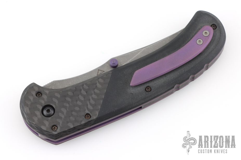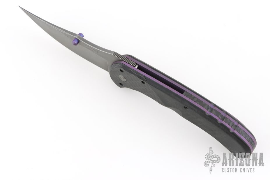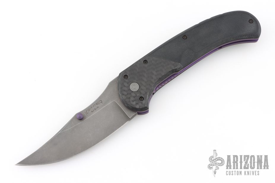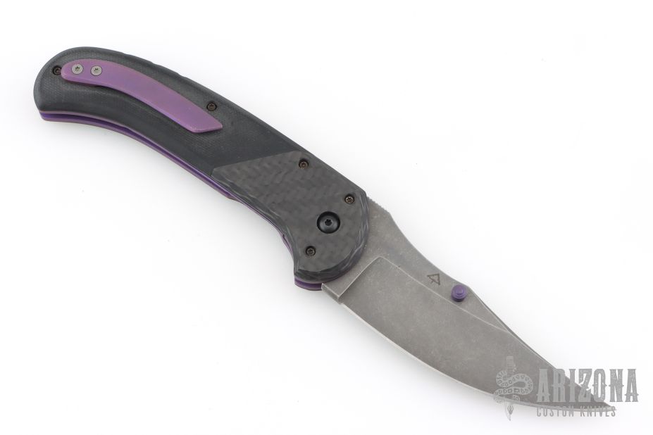This Reaper folder from Eric Kramer features an acid tumble finished blade with swedge and dual thumbstuds. The handle is made of carbon fiber dovetailed bolsters, anodized titanium liners, black G10 scales, notched carbon fiber backspacer and an anodized titanium tip up clip. Blade is centered when closed and locks up with no play, nice detent. Comes with a zippered case, and maker's card. Has some light scuffs, otherwise Excellent condition.