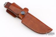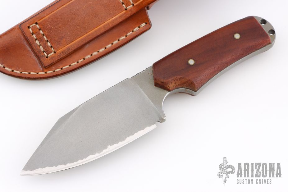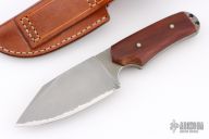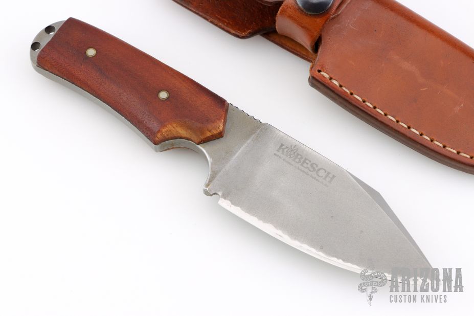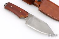 This Bushcrafter by Jens Kubesch features a bead blasted blade with simulated hamon, notched thumbrest, .238" blade stock and 1.528" blade depth, full tang construction. The handle has wood scales, lanyard hole at the butt. Comes with a brown leather sheath. Has some light scuffs, otherwise excellent condition.