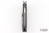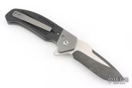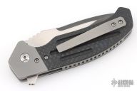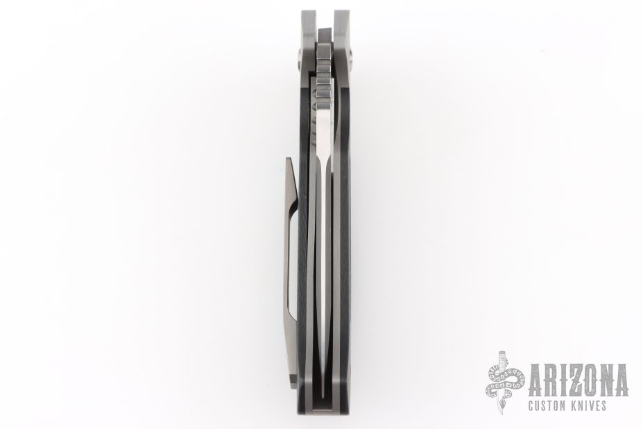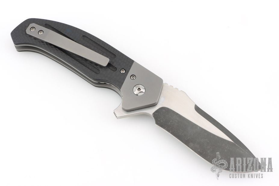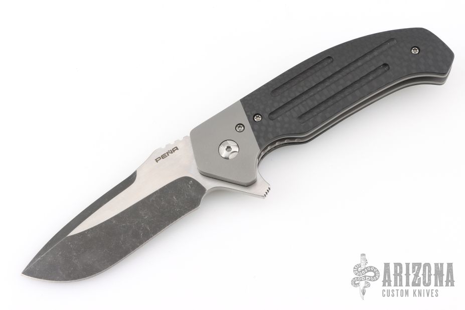 This Diesel flipper from Enrique Pena features a two-tone finished recurve blade with notched thumbrest and flipper and a false top edge. The handle has a stonewashed titanium frame/bolsters with milled carbon fiber covers, a matching tip up pocket clip and notched titanium backspacer.  Very nice detent, lockup and blade seating. Comes with a zippered case. Has a couple light scuffs and scratches, excellent condition otherwise.
