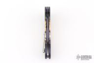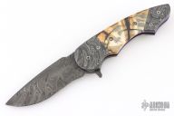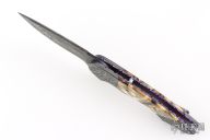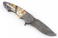 This Scorpion Flipper from Butch Ball features a Damascus blade with notched thumbrest and flipper. The handle is comprised of matching Damascus bolsters, front and rear, mammoth molar scales, anodized and file-worked titanium liners, tip up stainless steel clip. Rides on bearings, nice detent and lockup. Comes with a zipper case. Has a couple light scratches, otherwise excellent condition.