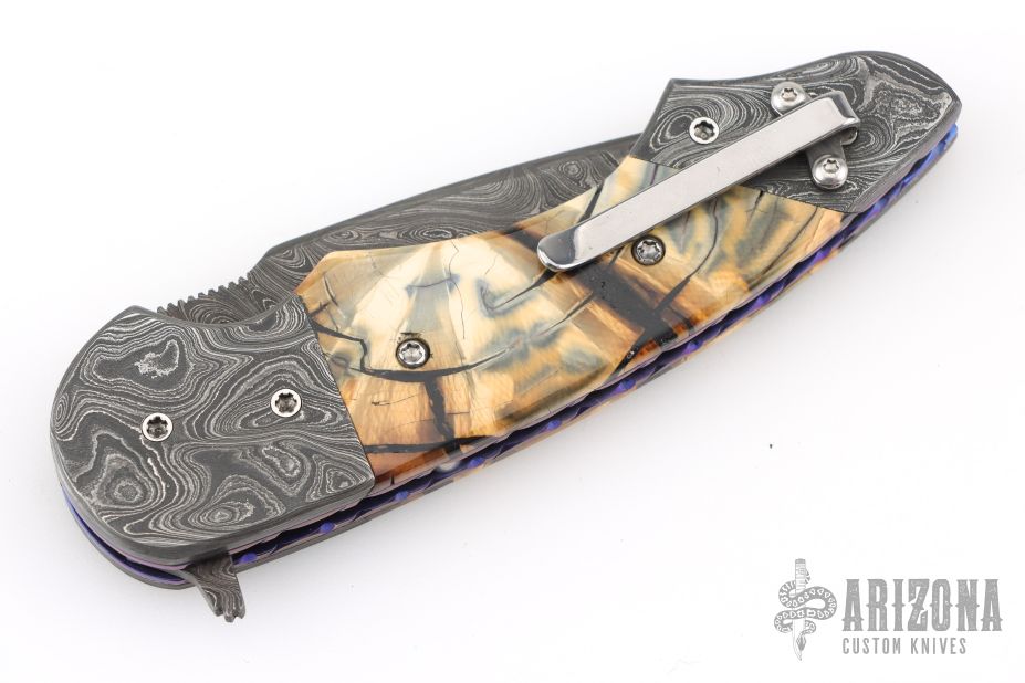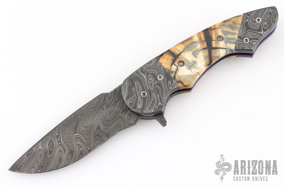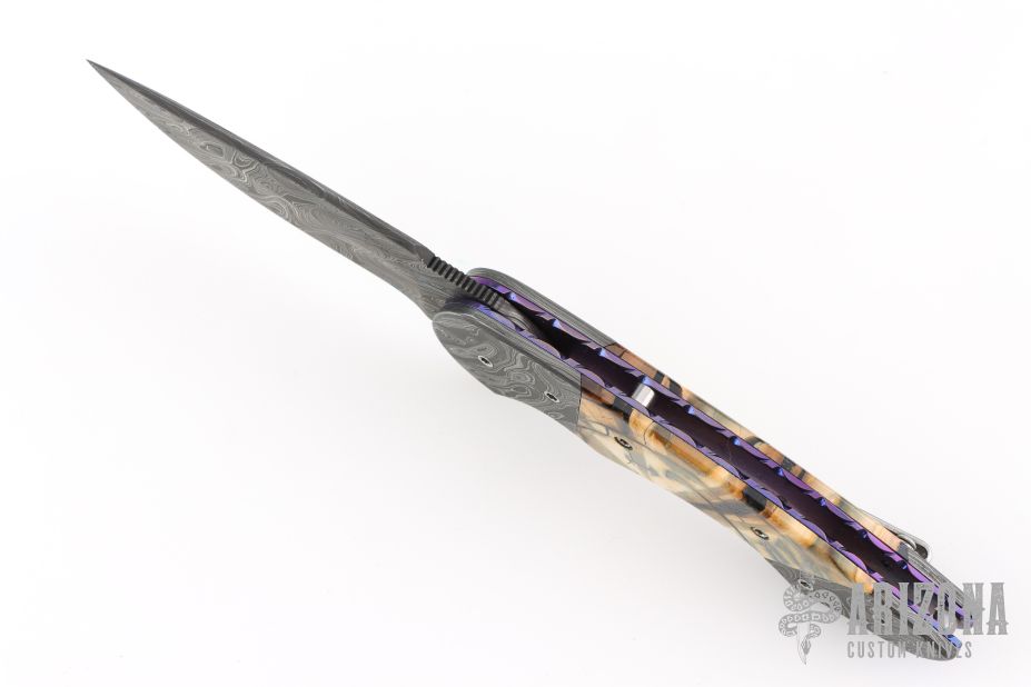 This Scorpion Flipper from Butch Ball features a Damascus blade with notched thumbrest and flipper. The handle is comprised of matching Damascus bolsters, front and rear, mammoth molar scales, anodized and file-worked titanium liners, tip up stainless steel clip. Rides on bearings, nice detent and lockup. Comes with a zipper case. Has a couple light scratches, otherwise excellent condition.