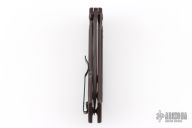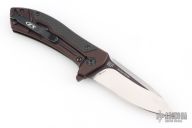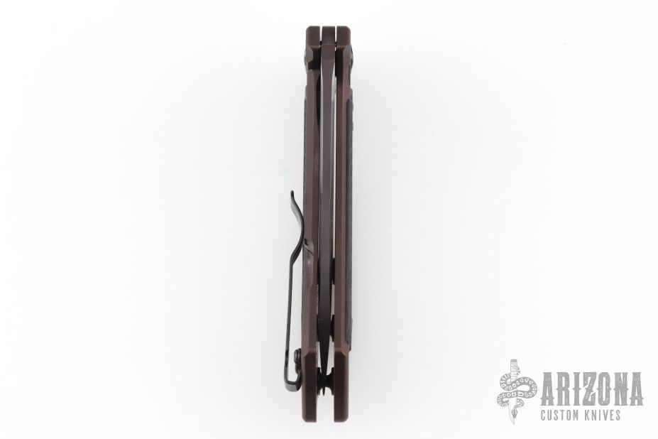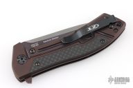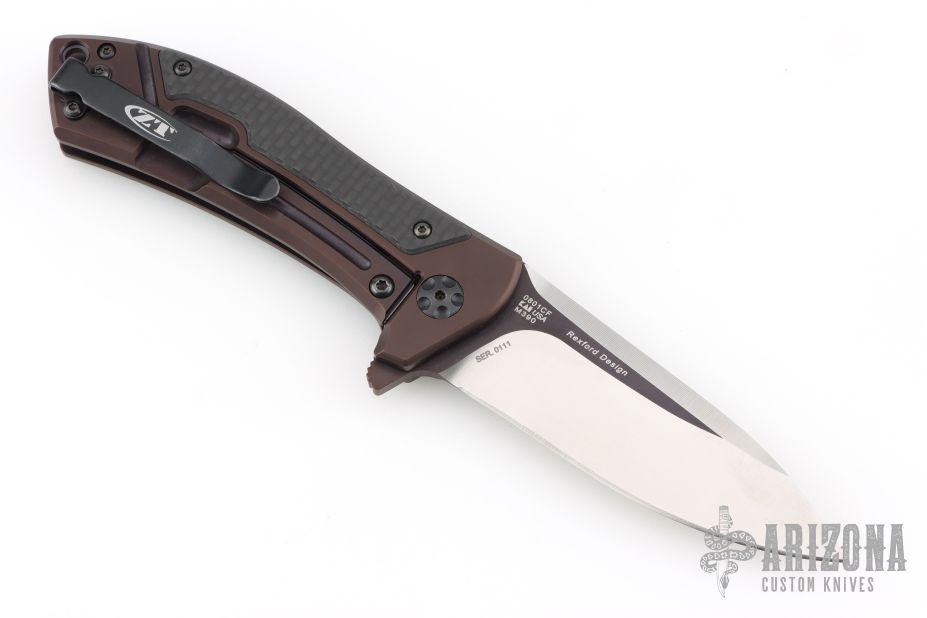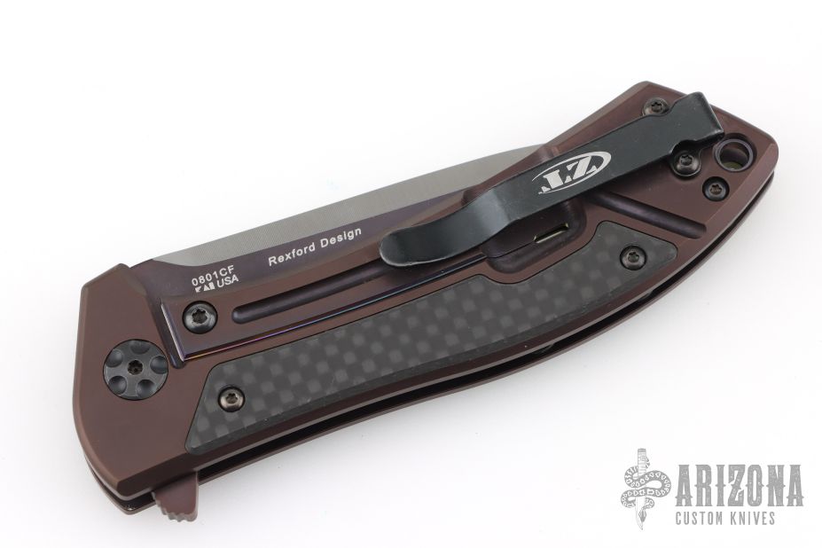 This 0801CF Rexford Limited Edition Copperhead Flipper #0111 has a two-tone satin and black M390 stainless steel drop/spear point blade. Handle is anodized titanium with carbon fiber overlays, black finished stainless steel tip up (RH/LH) clip, and lanyard hole. Excellent condition. Comes with a zippered case.