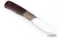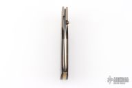 This linerlock by Steve Hostetler features a mirror polished blade with single thumbstud. The handle has mokume bolsters, wood scales, anodized titanium liners with jeweled interiors, stainless steel backspacer. Nice detent, lockup and blade seating. Comes with zipper case, and maker's card. Has some light scratches, otherwise Excellent condition.