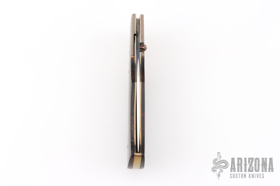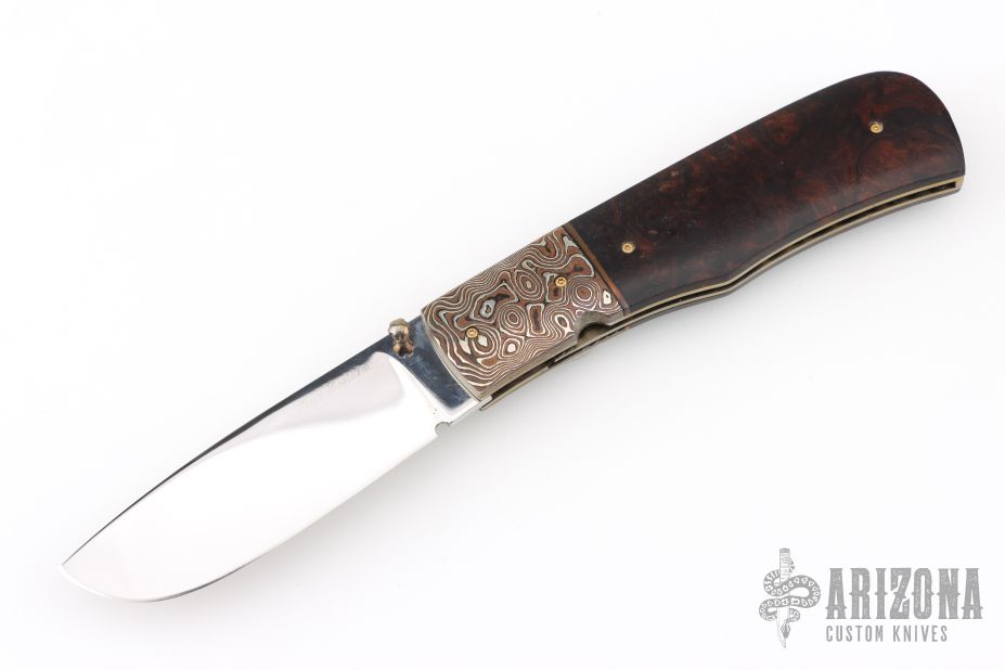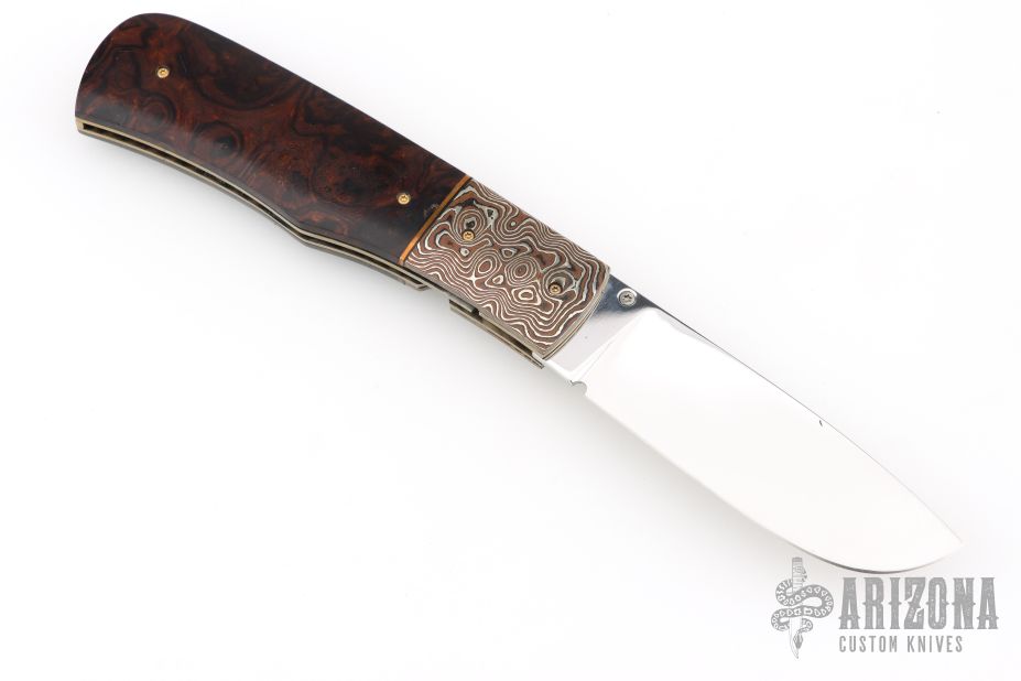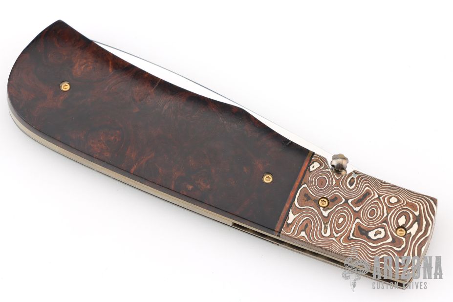 This linerlock by Steve Hostetler features a mirror polished blade with single thumbstud. The handle has mokume bolsters, wood scales, anodized titanium liners with jeweled interiors, stainless steel backspacer. Nice detent, lockup and blade seating. Comes with zipper case, and maker's card. Has some light scratches, otherwise Excellent condition.