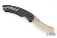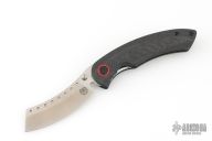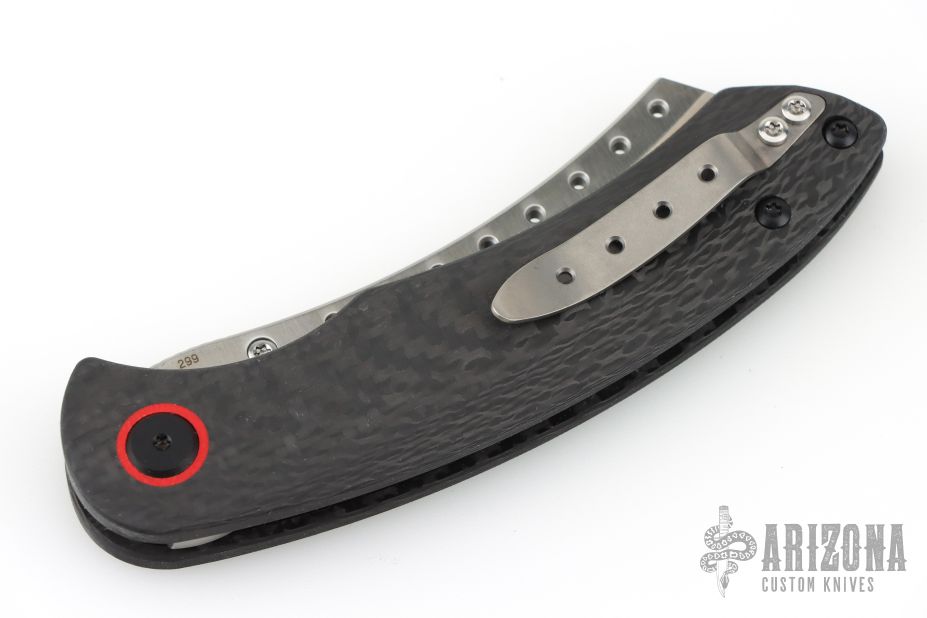 The Red Horse Knife Works Hell Razor P features a stonewashed blade with dual thumbstuds and a notched thumbrest. The handle has carbon fiber scales with red G-10 pivot collars, inlaid stainless steel liners, tip up bead blasted titanium clip. Comes with original box. Excellent condition.