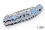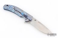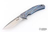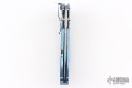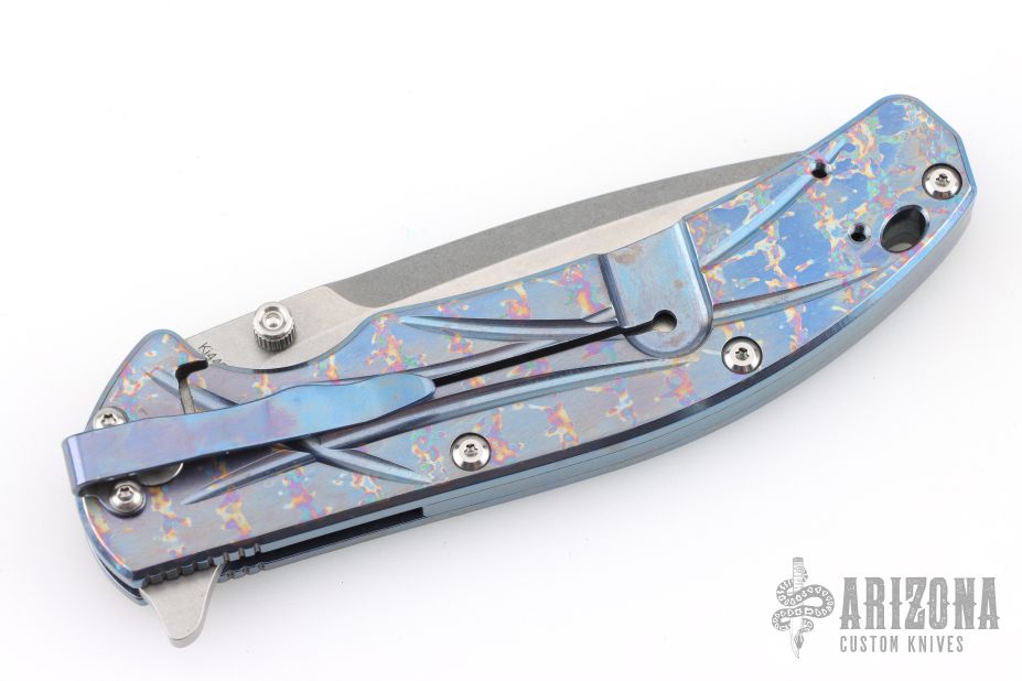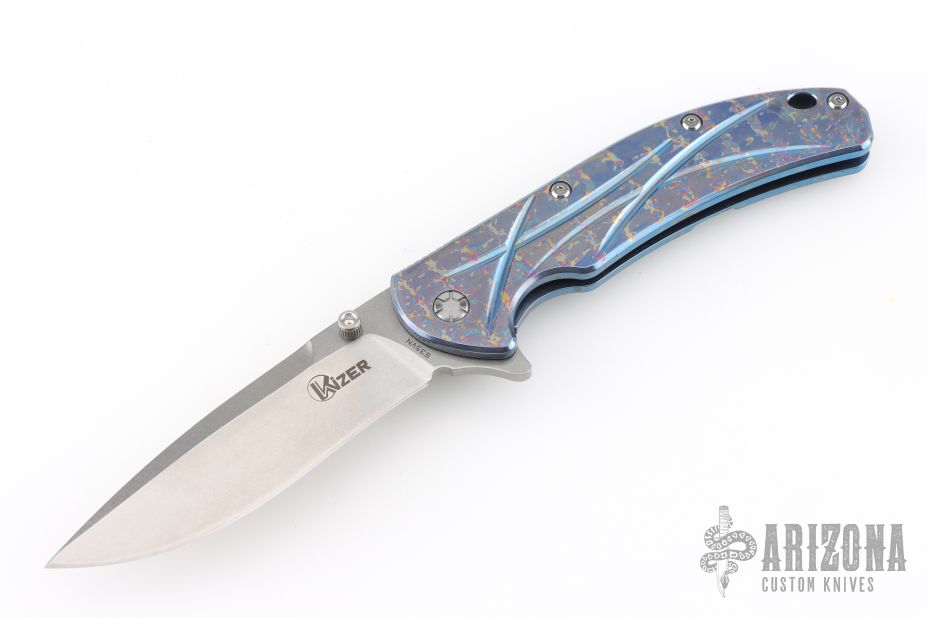 This knife Kizer features a tumble finished recurve blade with flipper tab and dual thumbstuds. The handle is comprised of polished and anodize finished titanium over titanium backspacer and matching tip down reversible clip. Comes with original box and papers. Excellent condition.
