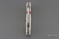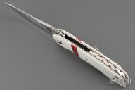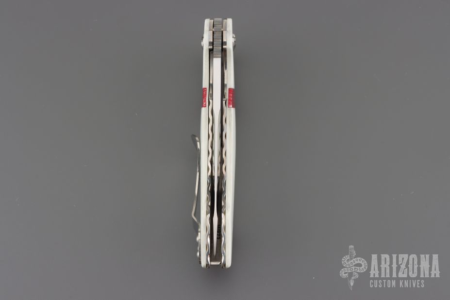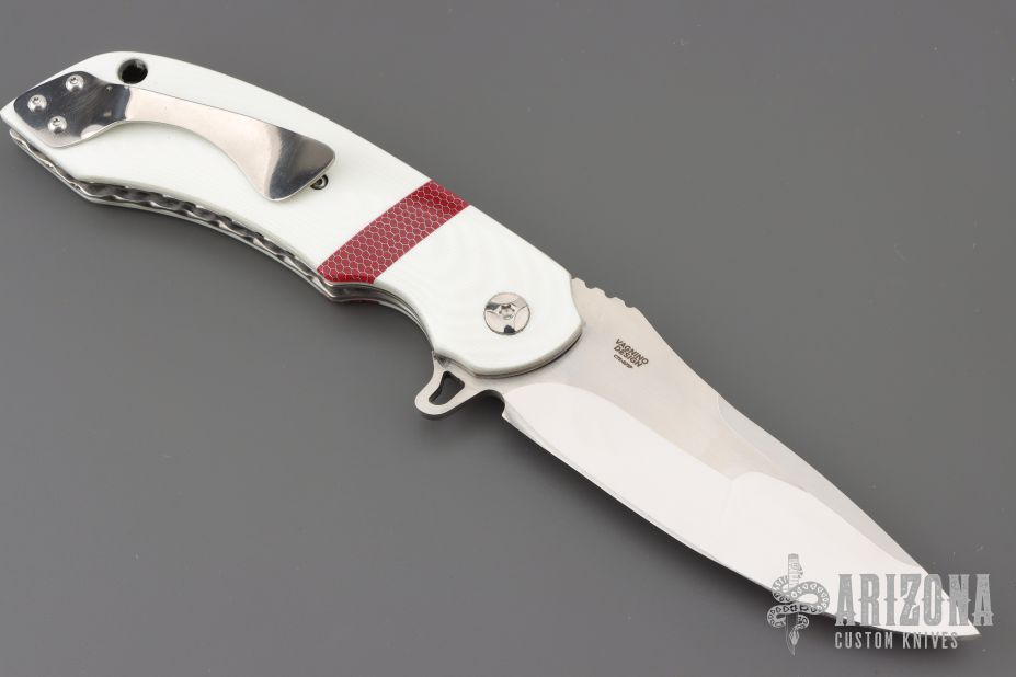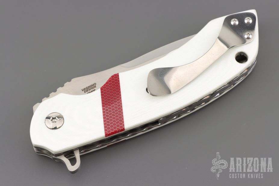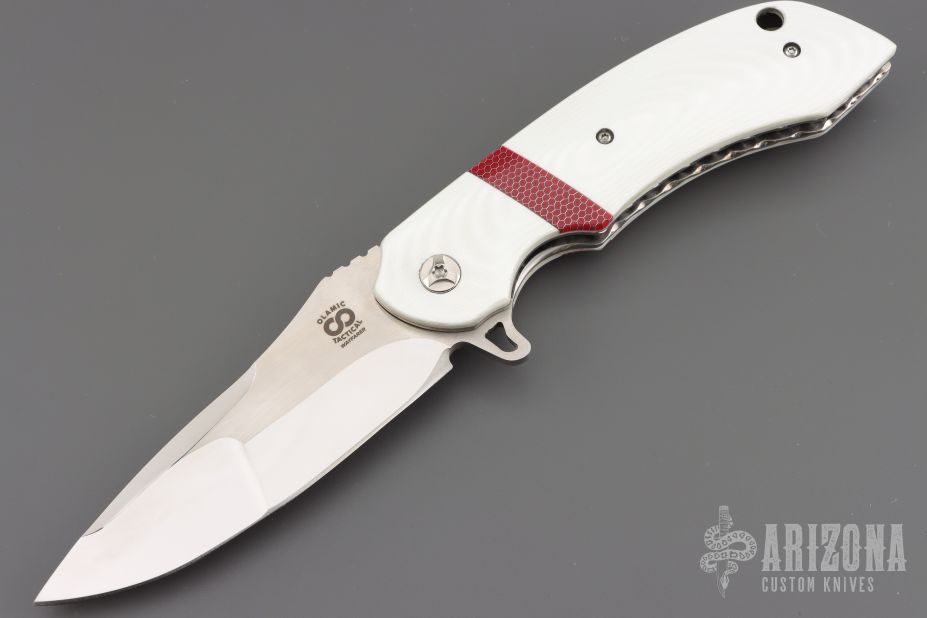 This custom Mike Vagnino designed flipper from Olamic Cutlery features white G10 scales with red C-Tek inlays. CTS-875P Compound grind blade with mirror bevels, satin flats, notched spine and flipper tab. Tip up titanium clip, polished file worked liners, and file worked backspacer. Great action that requires no wrist movement. Early and strong lock up and nice detent. W873 on the inside of the backspacer. Comes with original zipper case and COA. Excellent condition.