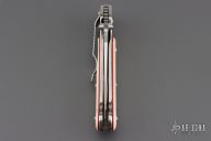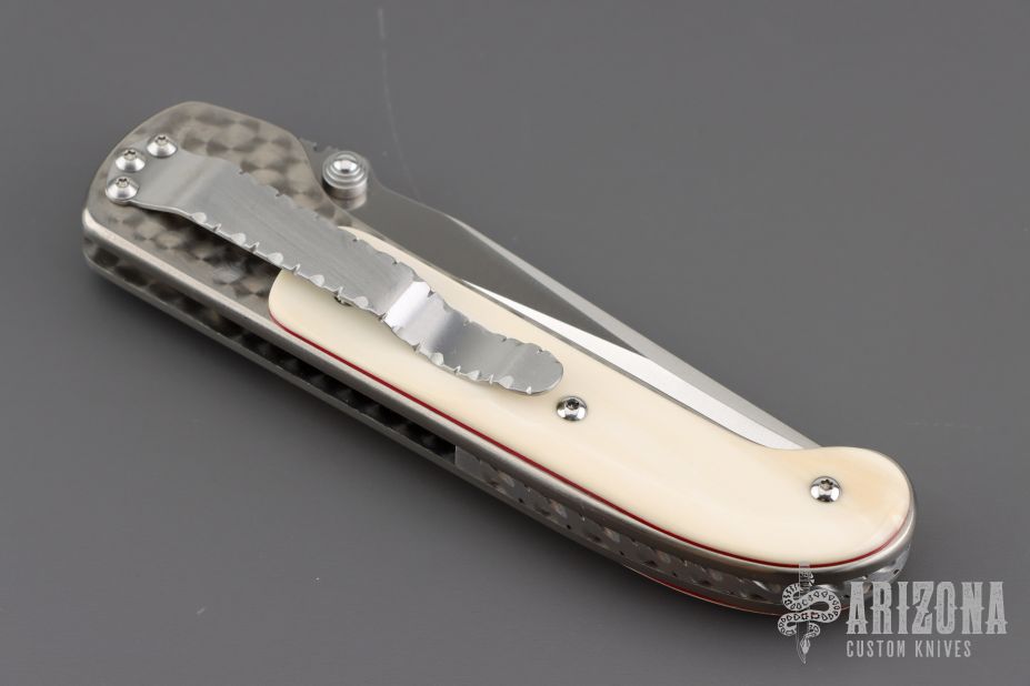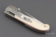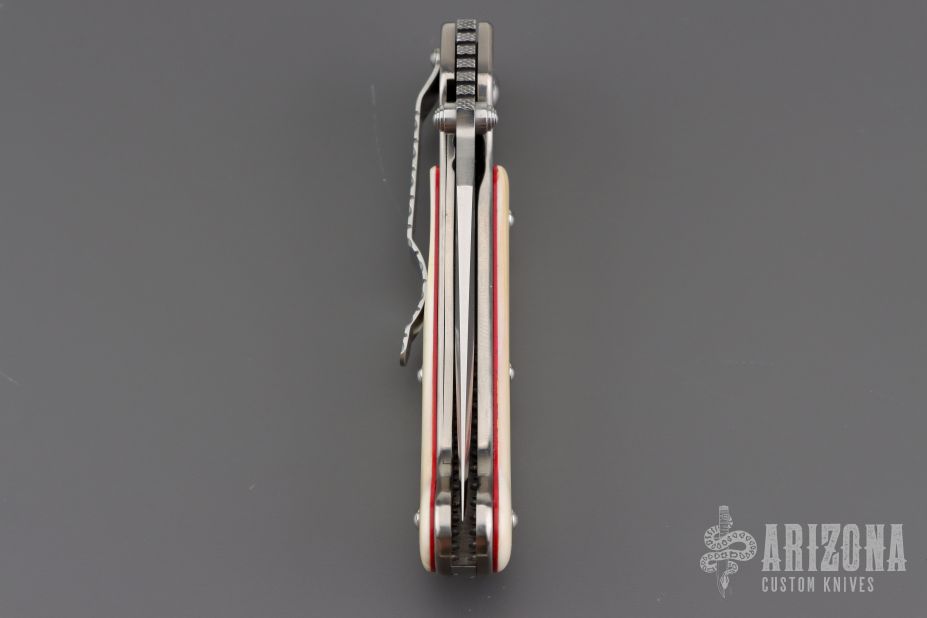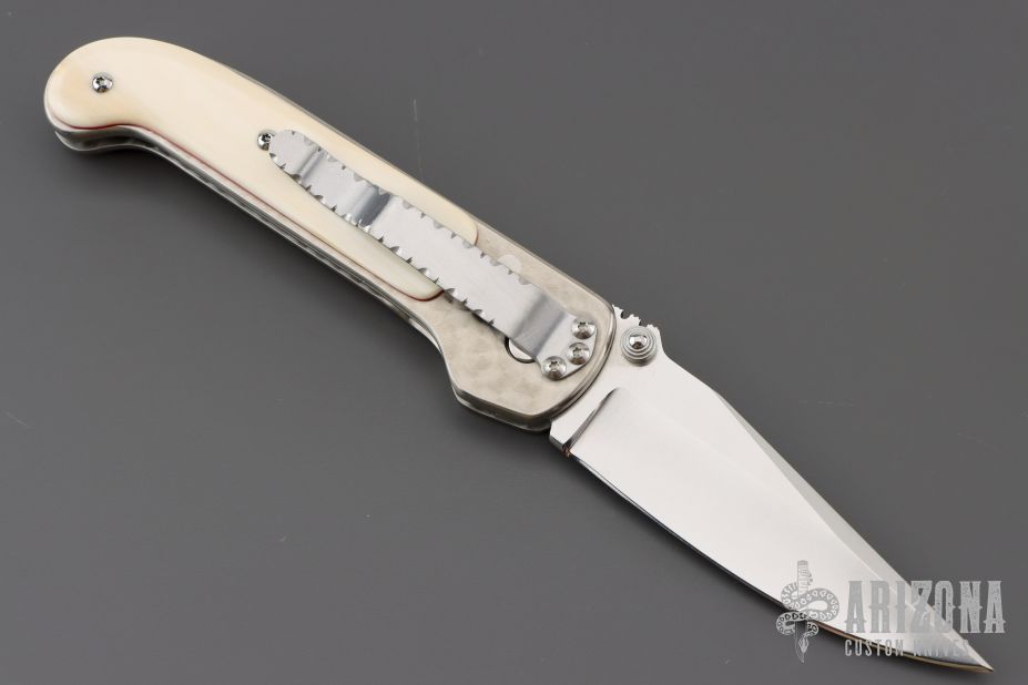 This Shark Recon linerlock folder by Crawford Knives features a satin finished clip point blade with dual thumbstuds and checkered thumb ramp. The handle has a jeweled titanium frame, walrus ivory scales with red liners, titanium liner, fileworked stainless steel backspacer and tip down clip. Nice action, detent, and blade seating. Comes with a zippered case. Has a couple very light scratches, otherwise excellent condition.