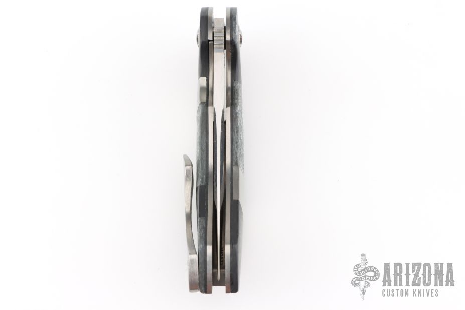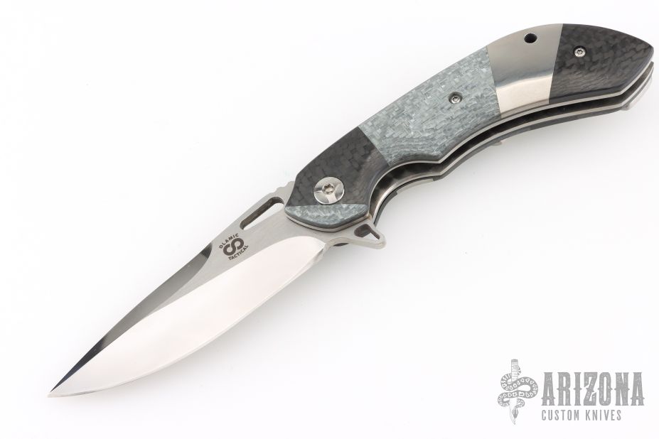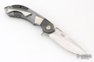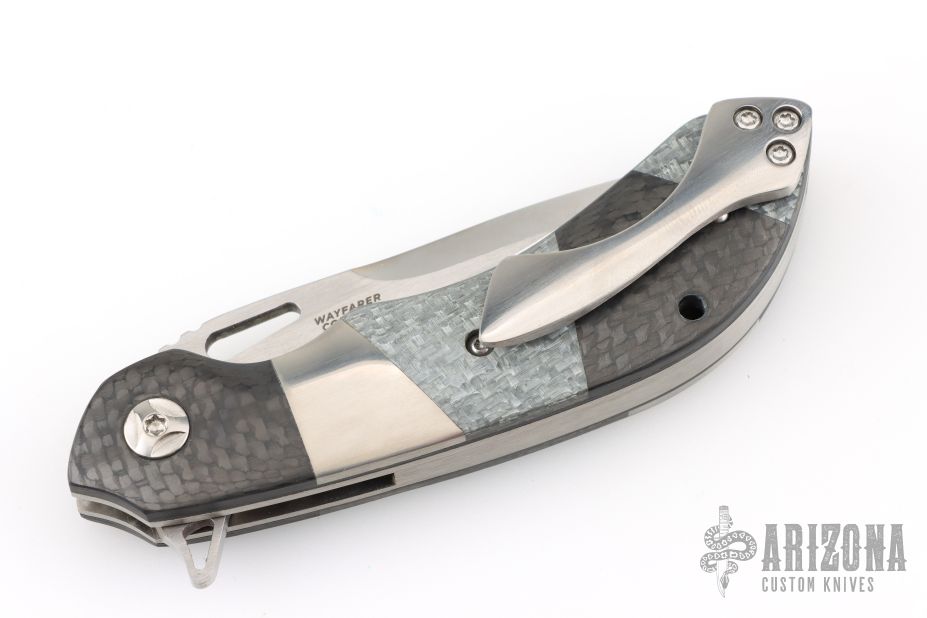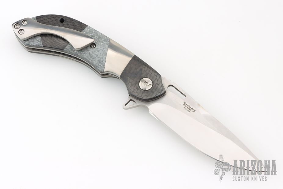 This custom Mike Vagnino designed Compact Wayfarer flipper features a mirror finished blade with notched thumbrest and flipper. The handle has carbon fiber, silver twill and patchwork covers, tip up clip and satin finished backspacer, satin finished titanium liners with jeweled interiors. Great action that requires no wrist movement. Nice detent, lockup and blade seating. Comes with COA and zippered/padded case. Excellent condition.