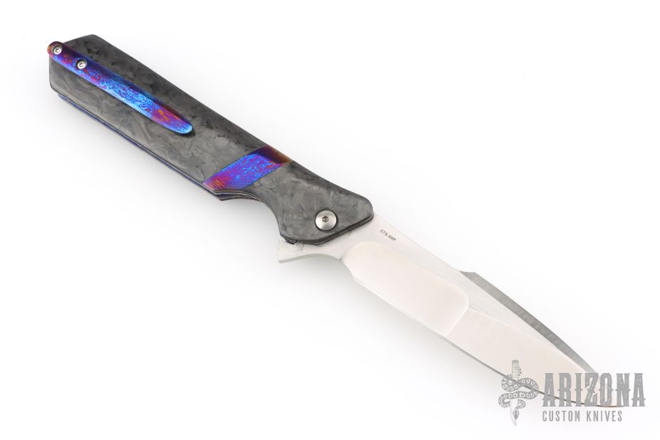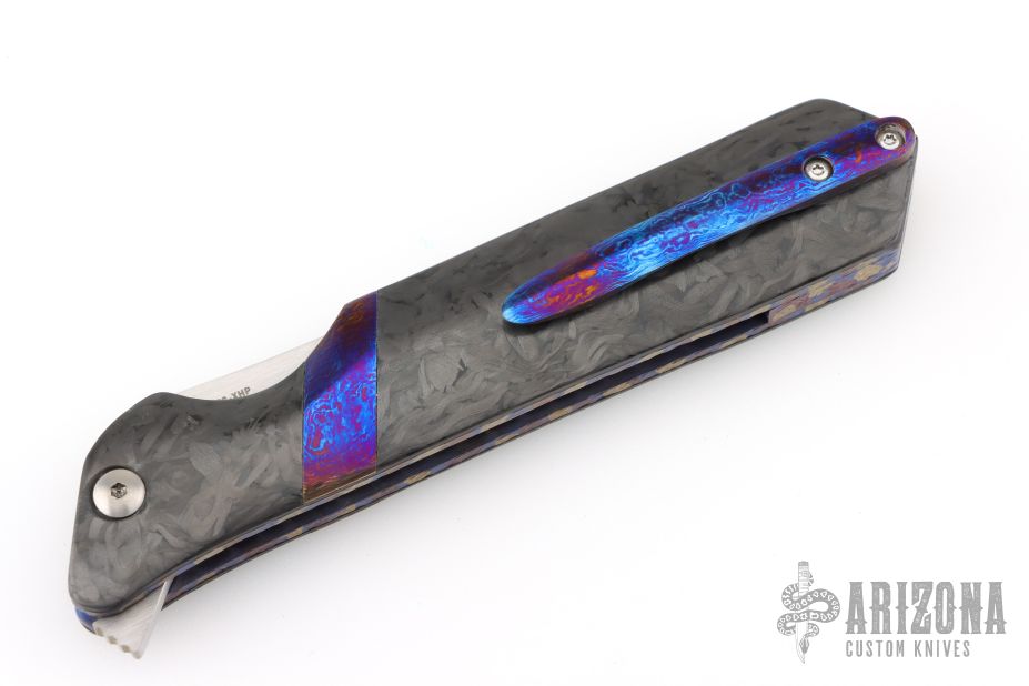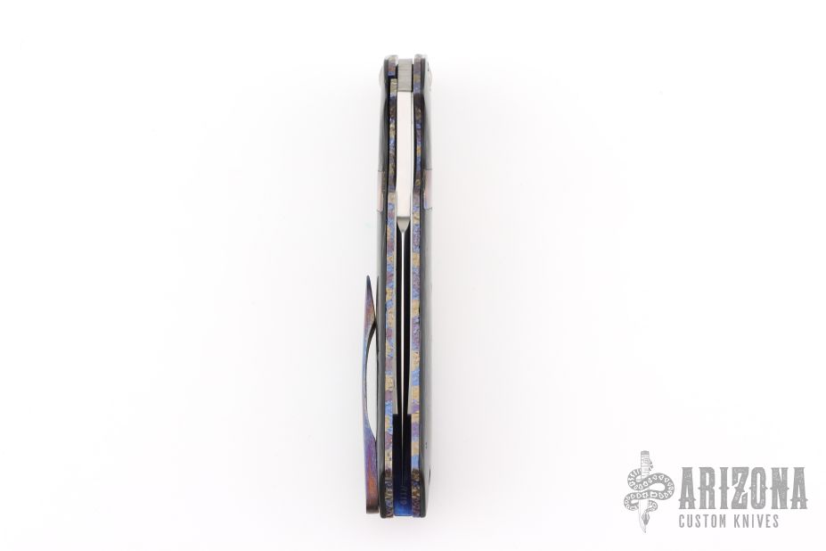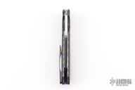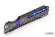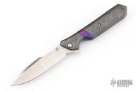 This Rainmaker flipper from Olamic Cutlery features a high satin finish blade with false top edge and flipper. The handle has Timascus spacer, and tip up clip, marbled carbon fiber scales, anodized and textured titanium liners and backspacer. Great action that requires no wrist movement. Early and strong lock up and nice detent. Knife is in excellent condition and shows no signs of use/handling. Ships in the original Olamic zippered clam shell case with certificate of authenticity.