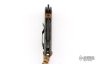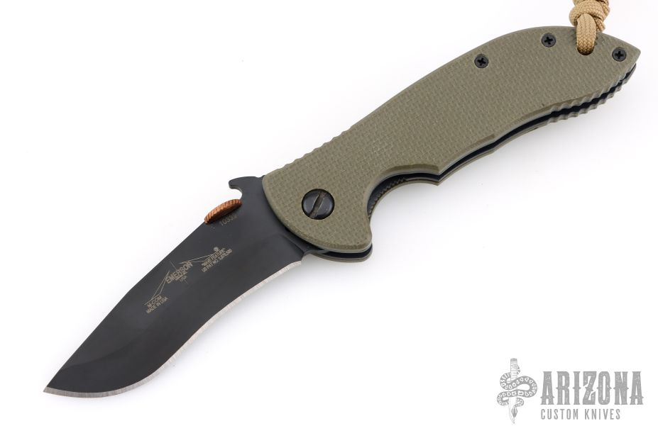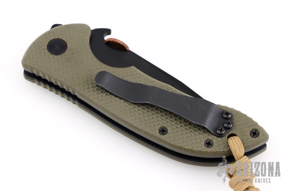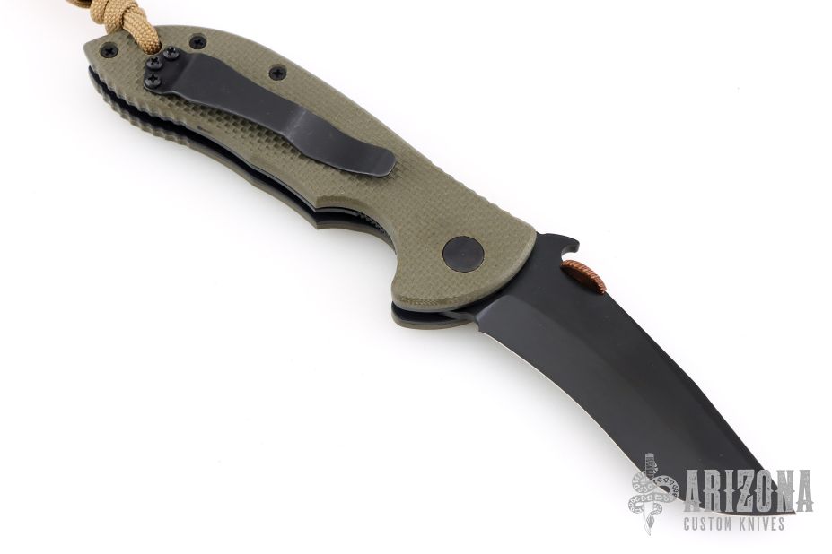 This Mini Commander from Emerson features a black recurve blade with notched thumbrest, copper monster thumb disc and wave feature. The handle has green G-10 scales, titanium liners and a tip up black stainless steel clip. Nice detent, lockup and blade seating. Excellent condition. Serial Number 10339.