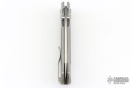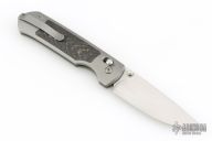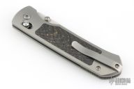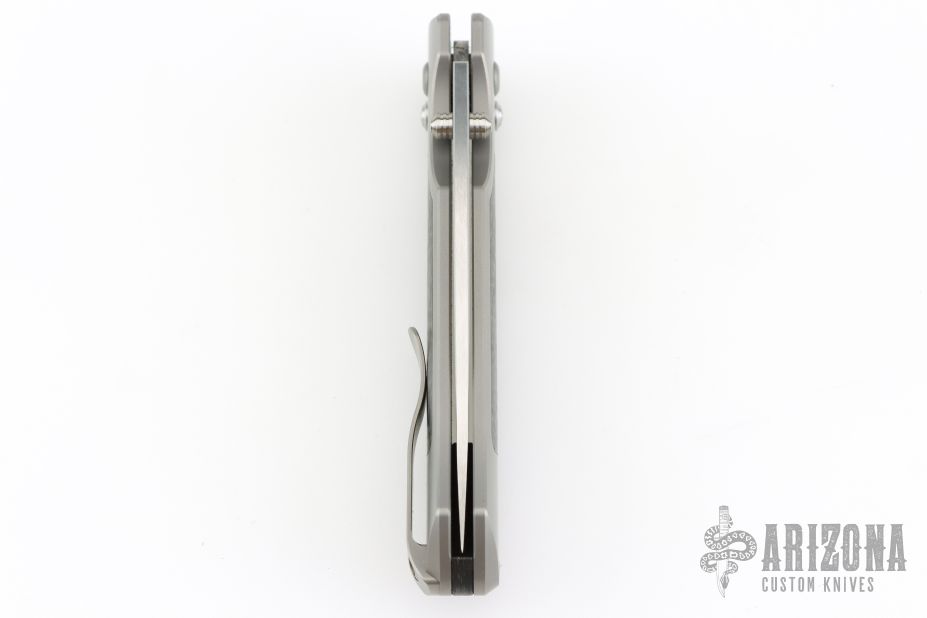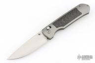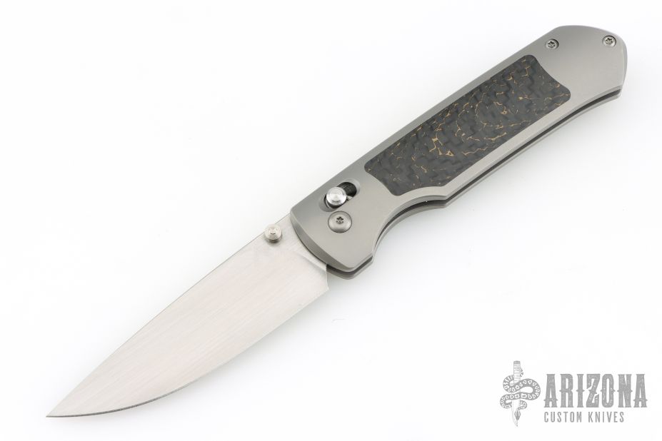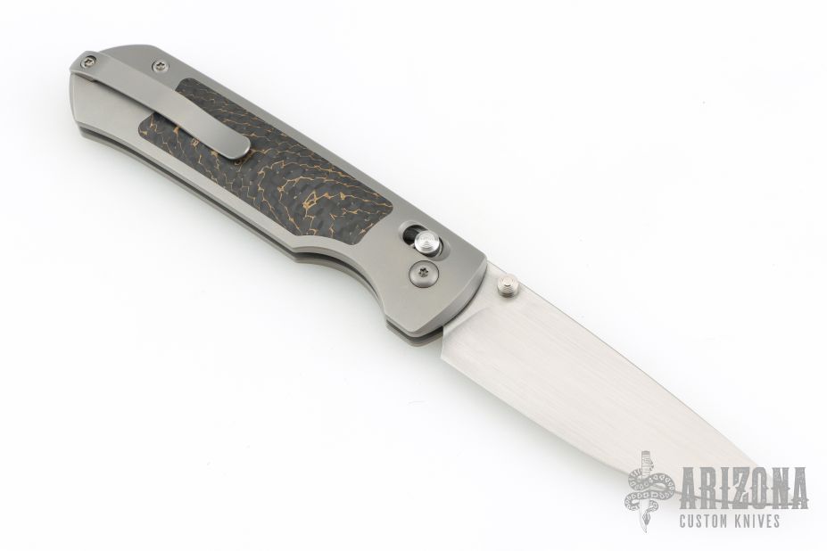 This Goat A.X.L. by Ohlone Knives features a hand rub satin finished blade with dual thumbstuds. The handle has a bead blasted titanium frame with brass carbon fiber inlays, bead blasted titanium clip and hardware. Nice lockup and blade seating. Comes with zippered case and pen. Excellent condition.